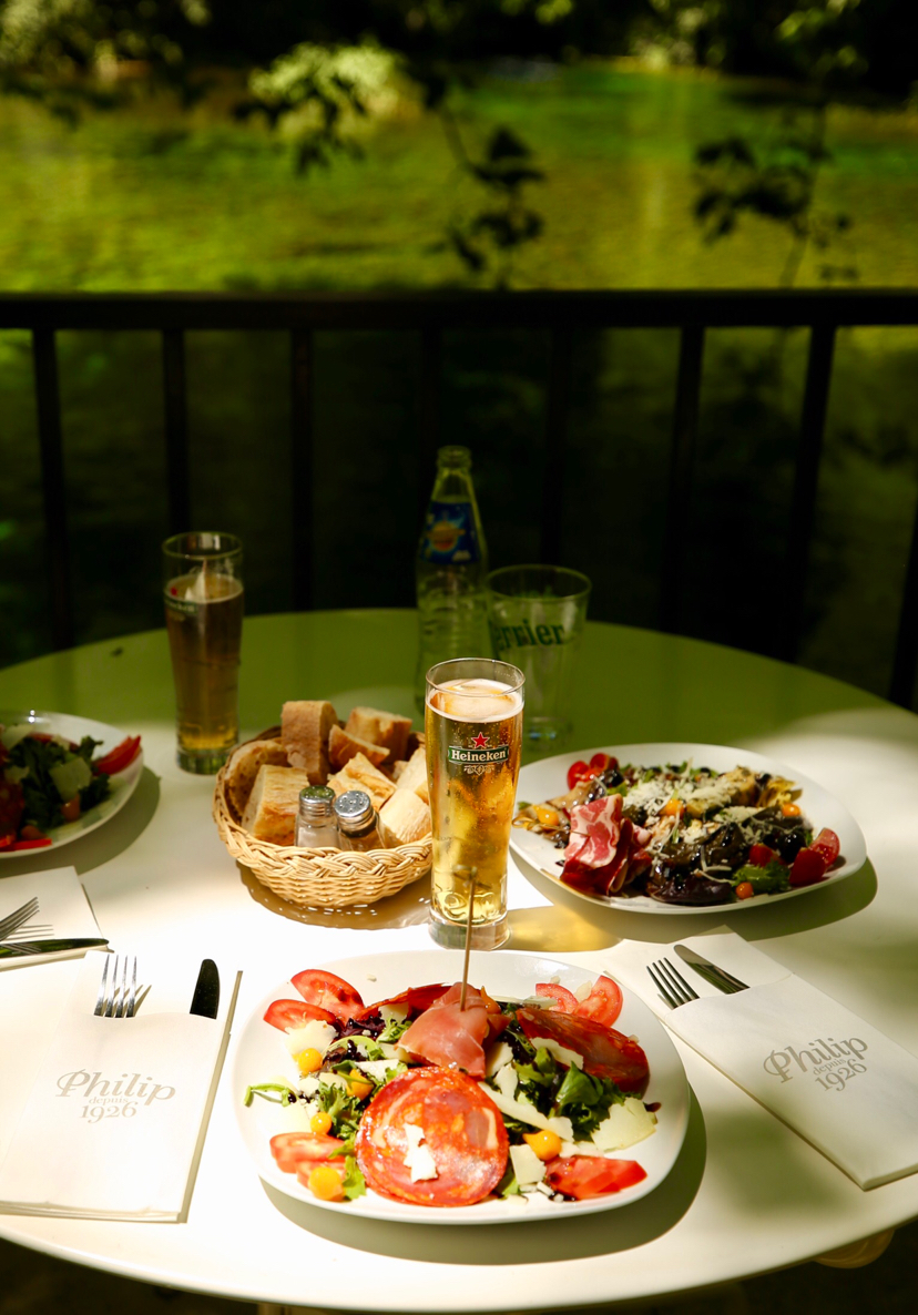 一个人旅行是有点孤独不错,有时候心里会惴惴不安,但是我其实还蛮上瘾这种感觉,隔不多久就喜欢自己出去走走。对面来了位满头银发的老太太也是一个人在旅行,至少有七八十的样子了吧,点了一份蔬菜色拉用不怎么有牙齿的嘴巴津津有味在咀嚼,希望我老的时候也还能像她享受一个人旅行,享受生活。突然,老太太也看到我了,微笑对我说:Bon Appetit!我举杯回敬:Bon Appetit!