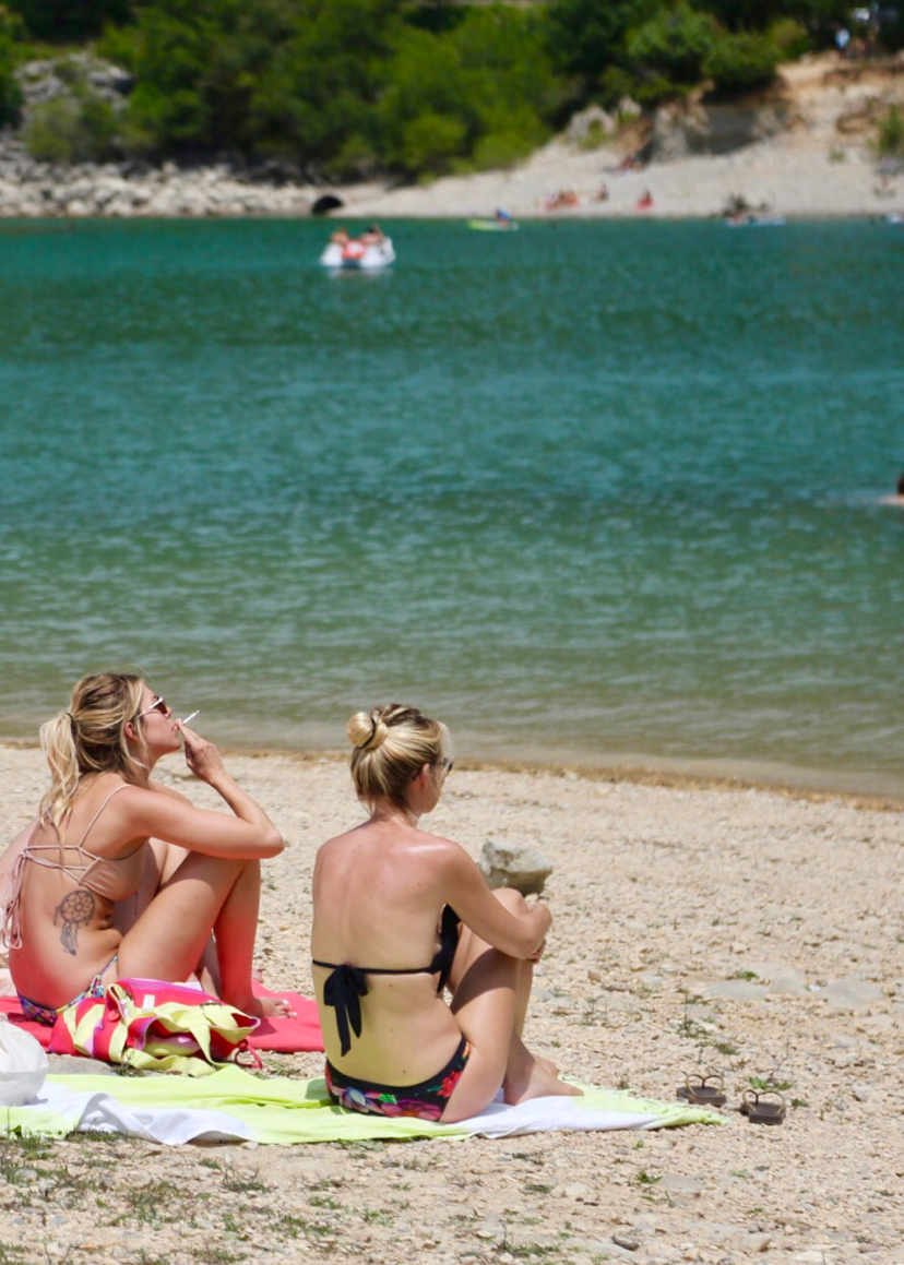 圣十字湖里很多人在玩皮划艇、脚划船。当地的欧洲人都很享受南法的阳光,任皮肤晒成古铜色。