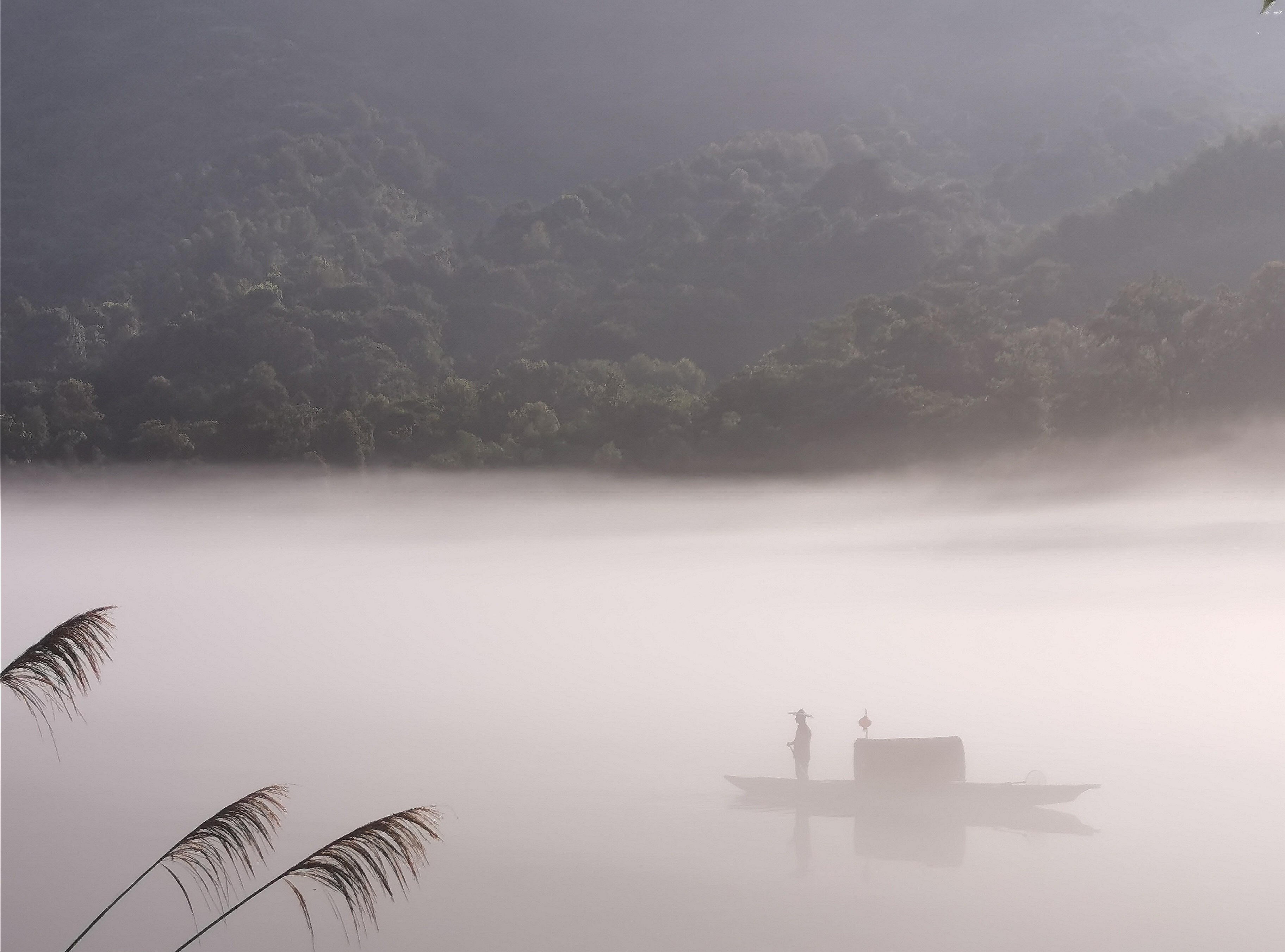 江上满满是像仙境一样的青雾,像轻纱一样拨来拨去,笼罩了山水,一切看上去好像都不太真实。