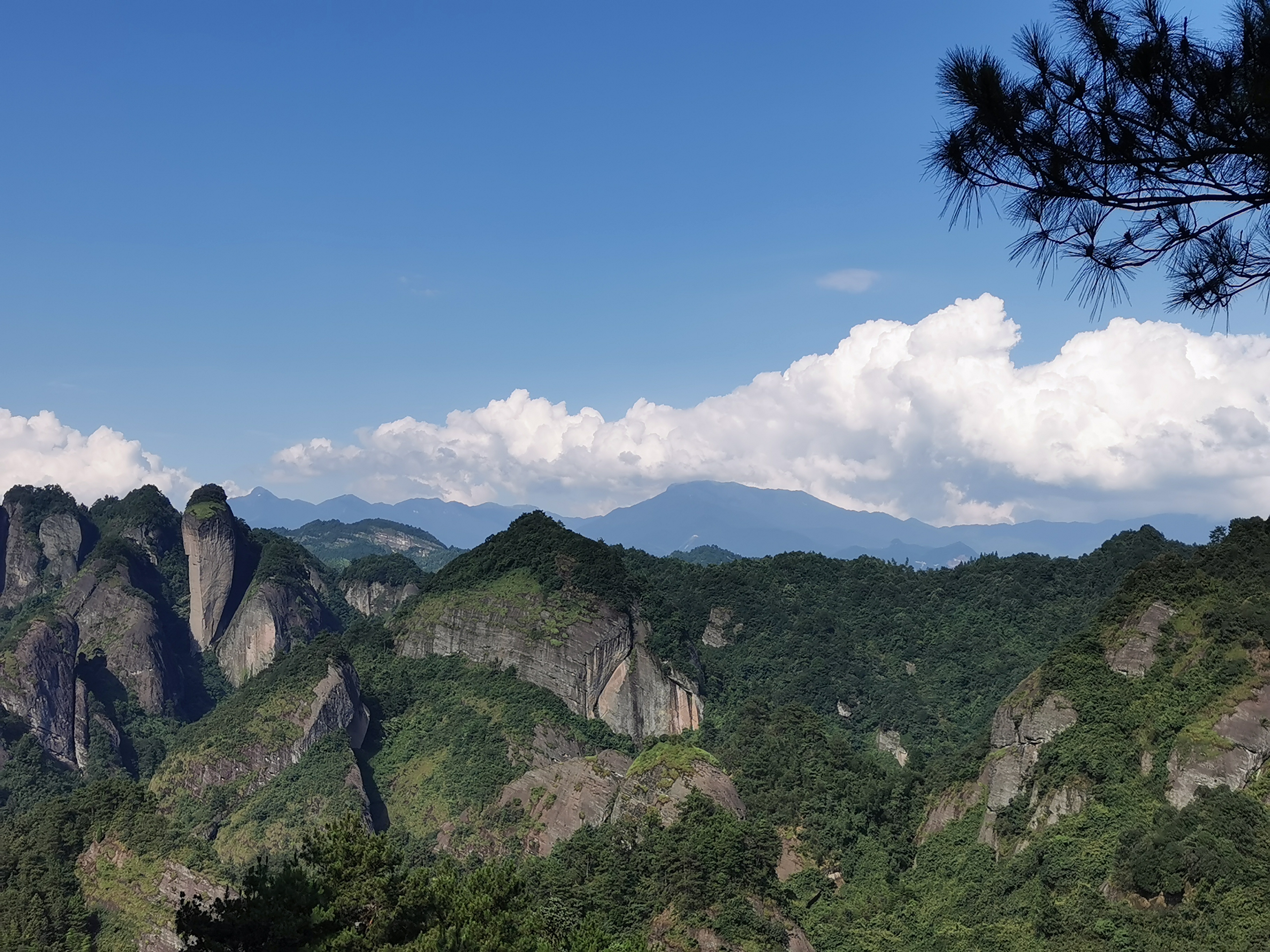 登上八角寨峰巅,四周是丹霞裸露的万丈深渊,幽深莫测的峰林峡谷,纵横交错,峭拔挺立的群峰,此起彼伏,如鲸鱼闹海,形神毕肖,蔚为壮观。