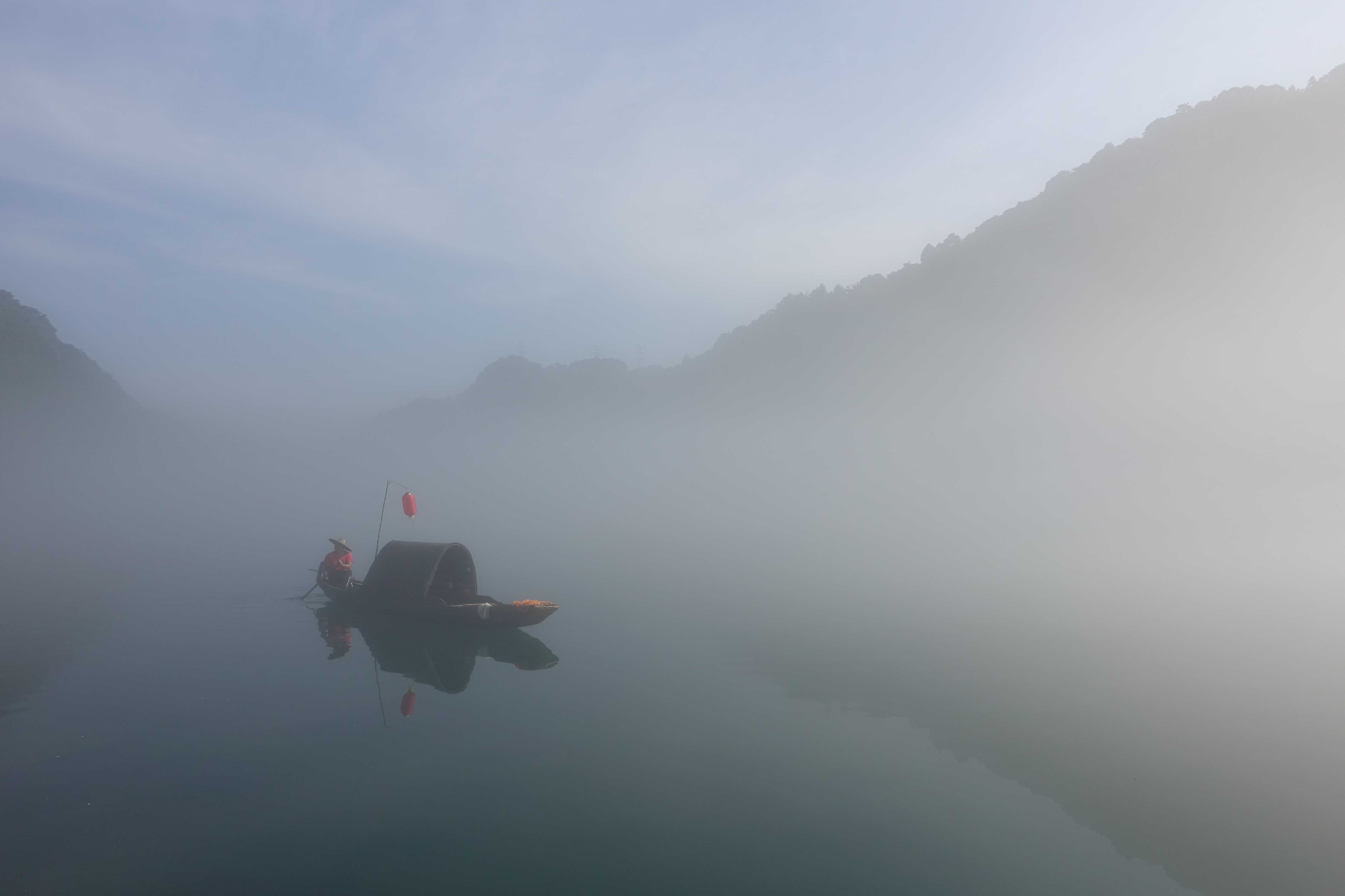 这是穿资兴而过的一条狭长平湖,以山水交融的东江湖为主体。小东江最值得一看的就是晨雾,以极具意境的雾景享誉摄影圈,每年夏季尤其7-9月间因昼夜气温变化大形成的雾景几率更高,是拍摄经典雾漫东江的最佳时间。晨昏的湖面水汽蒸腾,云雾缭绕,飘飘忽忽地在清泠的山水间游荡,神秘绮丽,柔和的阳光洒在湖面的晨雾上特别迷人,光影变化很有张力,加上清晨的渔夫撒网作业,乌篷船静静地穿行在薄雾间,在诗意唯美的东江雾景中营造出中国风风格的画面构图,或水墨淡雅,或工笔重彩!