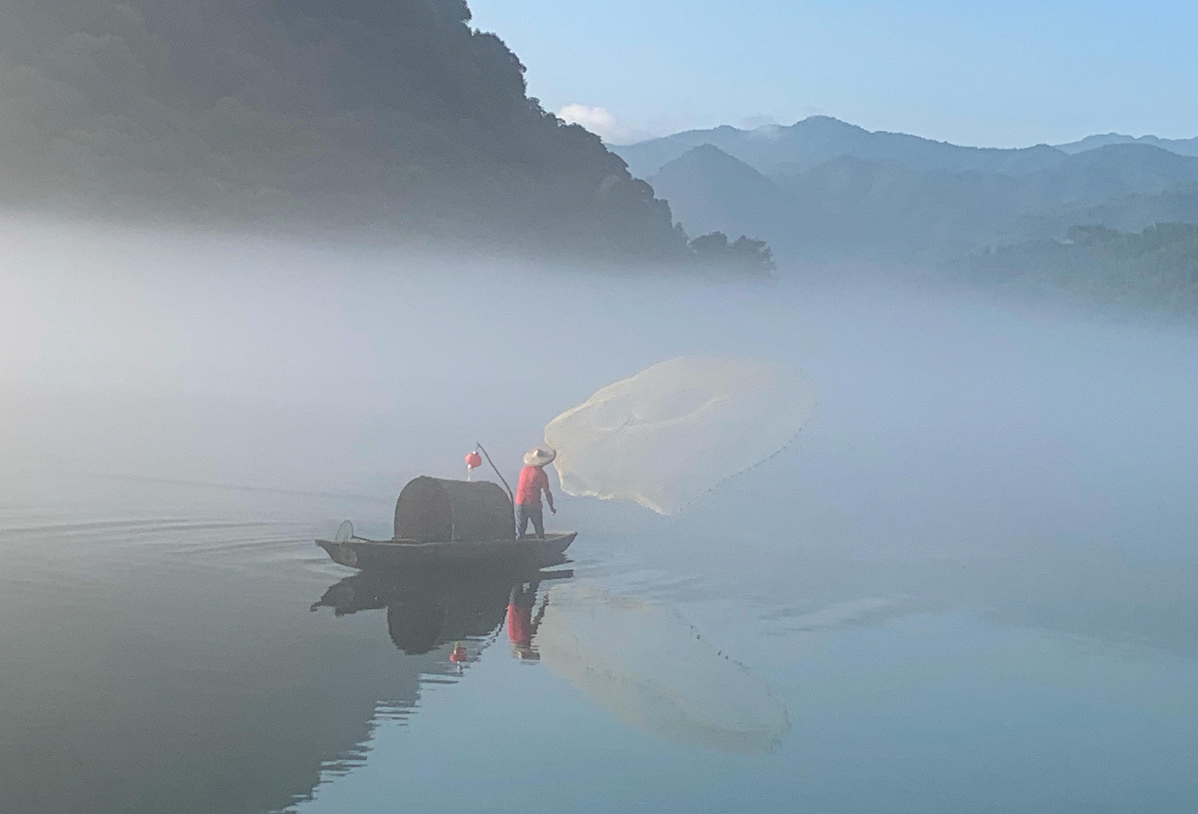 【2号拍摄点】日出晨雾、渔夫撒网,江面清凉的空气中弥漫着层层薄雾,随气流不断变化,如歌曼舞,飘飘欲仙。日出时分,阳光冲破江面雾气形成“耶稣光”!