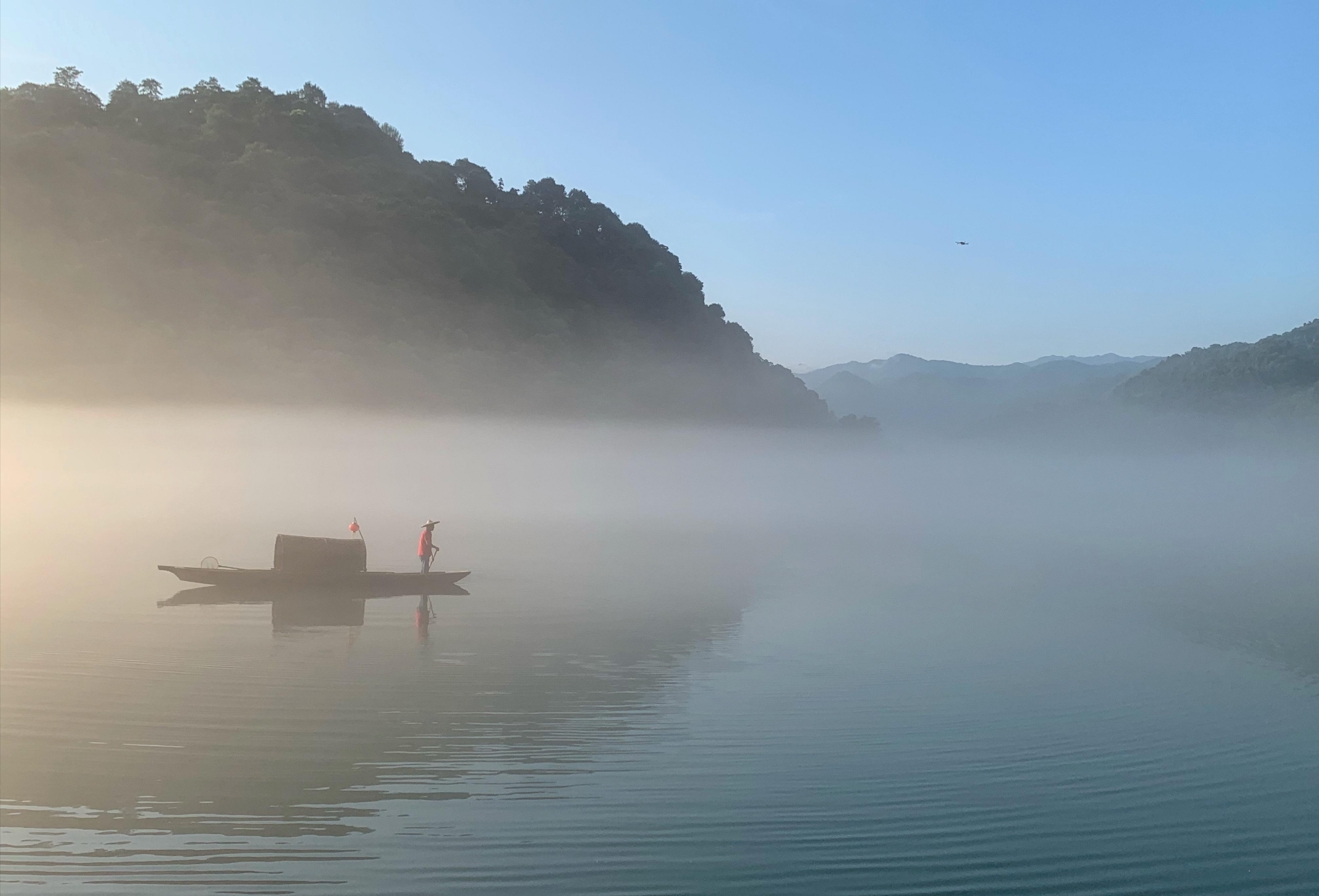 小东江早上日出刚爬上山的太阳,被浓雾笼罩的小东江,雾开则微风波动,霞光异彩,变幻莫测,别有一种不可言状的景象。天渐渐放亮,小舟上的红衫渔夫开始撒网,白雾绘出大片留白,大山涂抹出厚重浓墨,逆光勾勒出渔网金色的线条,定格出一幕幕极致唯美的水墨画。雾气时浓时淡、时聚时散,在湖面、山林间恣意的宣泄。