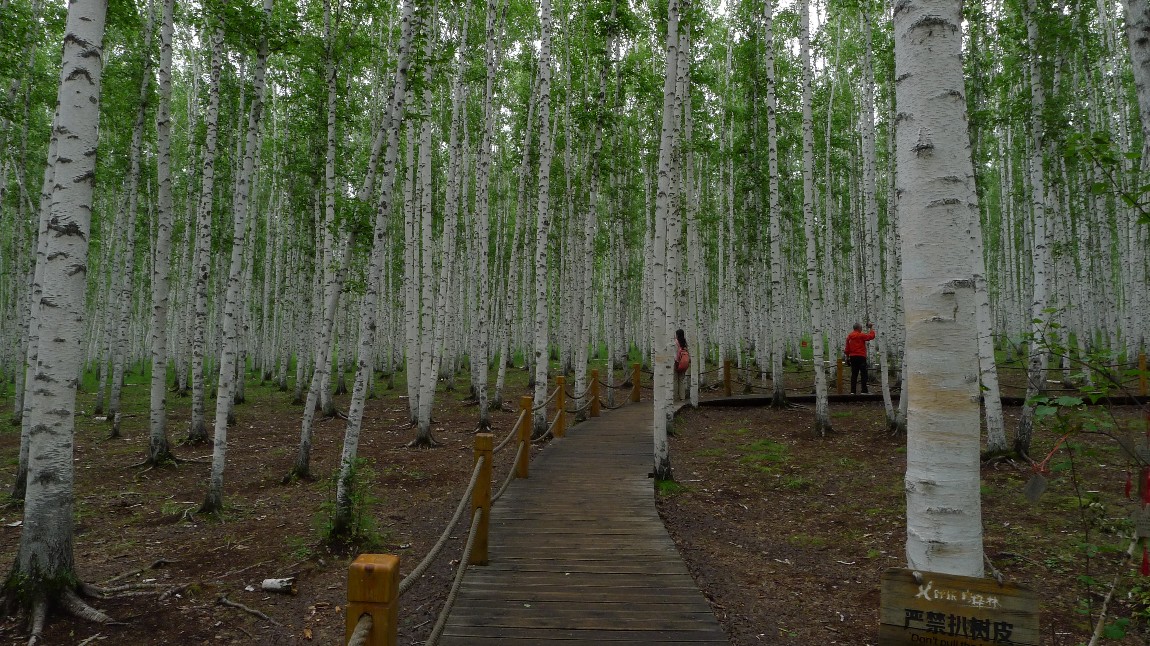 第五天早晨,离开室韦小镇,向梦幻的白桦林出发,路边开满了紫色的野花,特别茂盛,一大片一大片的,好看极了;进入景区后,换乘景区的观光车,乘车途中,依然是大片的紫花盛开,大家都叫不出花的名字,也无法拍照,那就留着以后再了解吧;虽然北京也有白桦树,大多是几棵或几十棵的一小片,没有大规模的;一路上也看到了不少白桦林,大多数都长得很细密,还以为是人工种植的苗圃,听导游介绍才知道,在土层薄,风大水多的地方,松树或桦树单独生长不易生存,极易被风刮倒,两树相伴而生可以抗争严酷环境,也是长期自然选择和淘汰的结果,所以大多数成片的白桦林中,会间杂着几棵松树,人们形象地称之为松桦恋。今天到的这大片的白桦林,相对来说,桦树比较粗壮,经常还有三颗、四颗共同生长的,一片雪白的白桦树,树下是松软的苔藓或嫩草,而苔藓是麋鹿最喜欢的美食,初次见到这大片的白桦林,大家惊喜过望,纷纷搂着白桦林拍照,只是非专业的摄影人员,面对高大的白桦树,拍照技巧有些不够用;在这里就显示出了怡然和婉约诗人的专业优势,二位反复构思,拍出来的照片明显比我们好看了许多。在白桦林中,还有一个小朋友喜欢的麋鹿园,15元买上一小篮苔藓,就可以到里面和小动物近距离接触,而麋鹿也喜欢围着小朋友的苔藓转圈,一瞬间篮子里的苔藓就被麋鹿吃光了。离开白桦林之前,喝了一杯桦树汁,20元一杯,真心不好喝,青草味加上树皮的味道,略苦一些,权当一种体验吧。