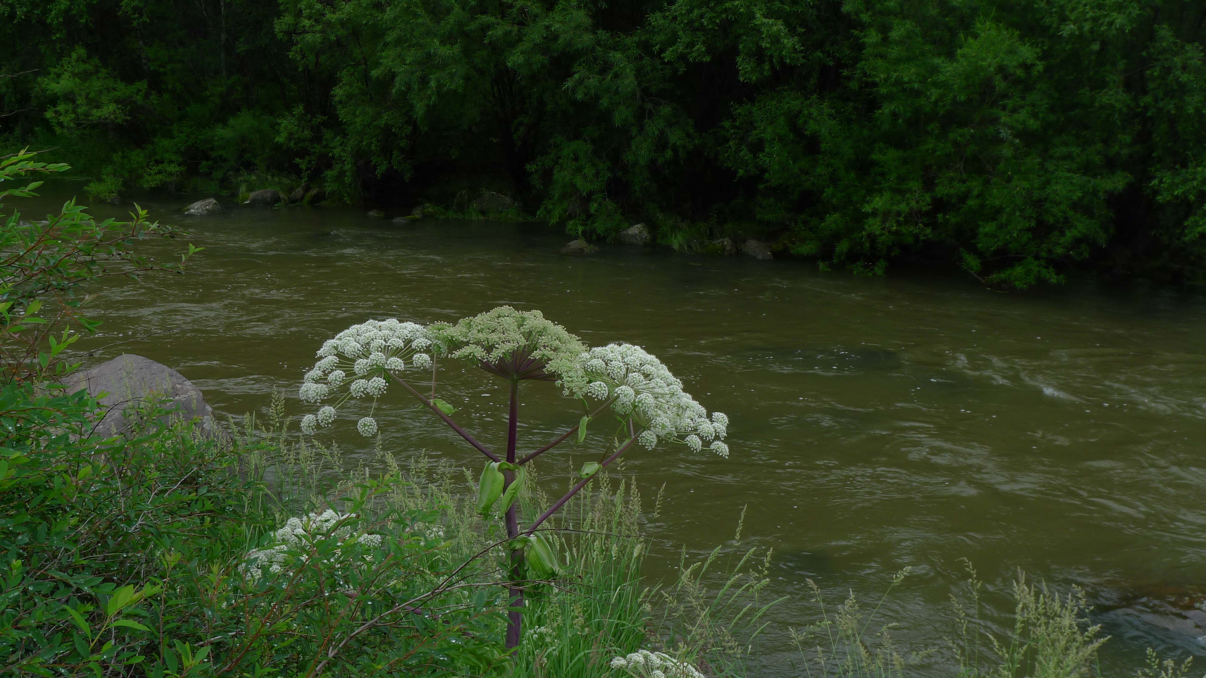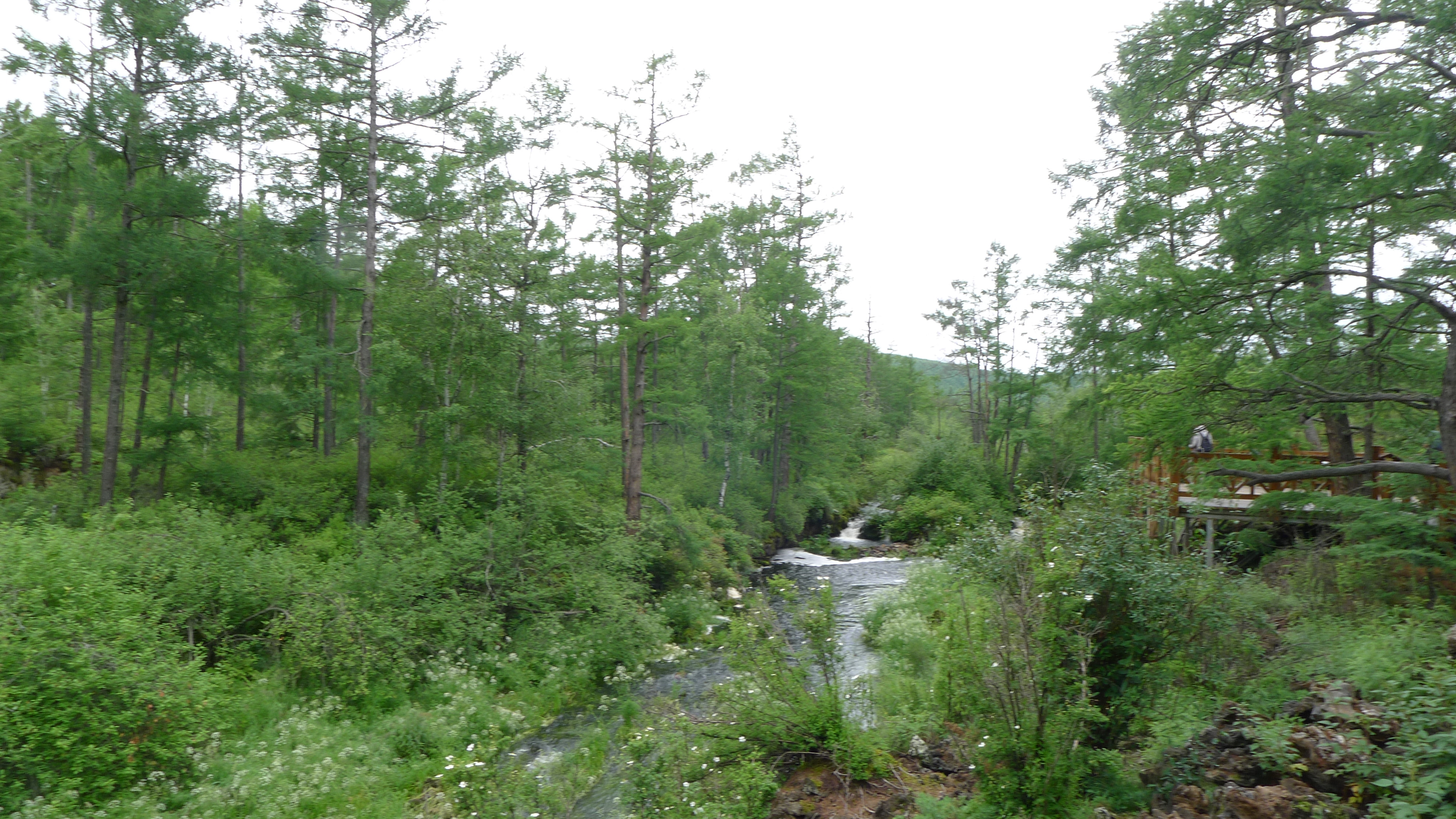 认清了柳兰,了却一桩心愿,回酒店和大家汇合,朝阿尔山景区进发,向往了许久的阿尔山,今天要识得真面目了,一路上不时有油菜花田静卧路旁,还有一条清澈的小河流淌,这就是哈拉哈河;我们进入景区,第一个欣赏的是三潭峡,是哈拉哈河的上游,与天池山遥相呼应。河床由岩石组成,湍急的哈拉哈河从河谷穿过,珠飞玉溅,波平如镜的卧牛潭、虎石潭和悦心潭三处潭水,故称三潭峡。三潭依次为卧牛潭——河水平稳,潭前大大小小的卧牛石横河摆放,如庞大的牛群静憩河中;虎石潭——平静的潭水上方,河流中密布着形态各异的巨大岩石,宛如虎群在河中玩耍嬉戏;悦心潭——是峡谷的尽头,地面豁然开朗,河面加宽,潭水透明,清澈见底。岸上有木栈道随河而行,走进这个峡谷,新鲜的空气让我们心旷神怡,我们沿步道行走依次欣赏着三潭,除了三潭,这里还有高大的兄弟松,和兴安第一松,因树身伟岸、树龄高古而闻名,估计树龄在四百年左右,树高30米,是熔岩台地植物生长演替的见证,而在岸边,开满了白色的独活花,更有白桦树间杂在松树之间,时常见到一二颗枯树根立在河边,那是大风刮断树干之后留存下来的产物,水中的石块上长满了碧绿的青草和青苔,在湍急的河流中,一副随遇而安、云淡风轻的样子,那种恬淡的境界,不正是我们所需要的吗?