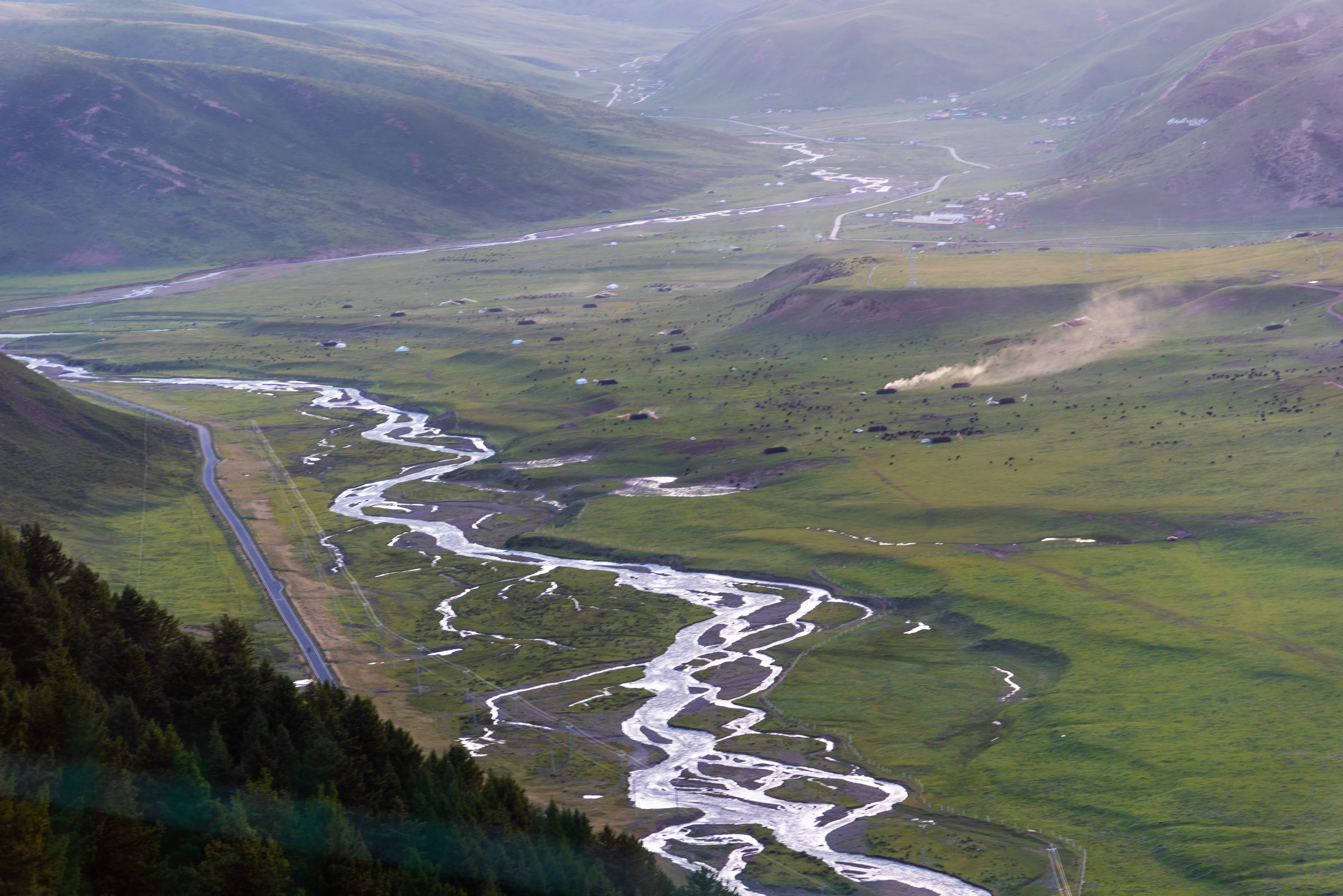 离开拉卜楞寺的时候天空已经飘起了小雨,上车后雨滴又变小了很多,路过桑科草原的时候,马路上没有一丝下雨的痕迹。继续行车不到半个小时,雨滴斜着向车窗砸来,公路上的溪流交错纵横,我不由得为正在桑科草原游玩的人们捏了把汗。