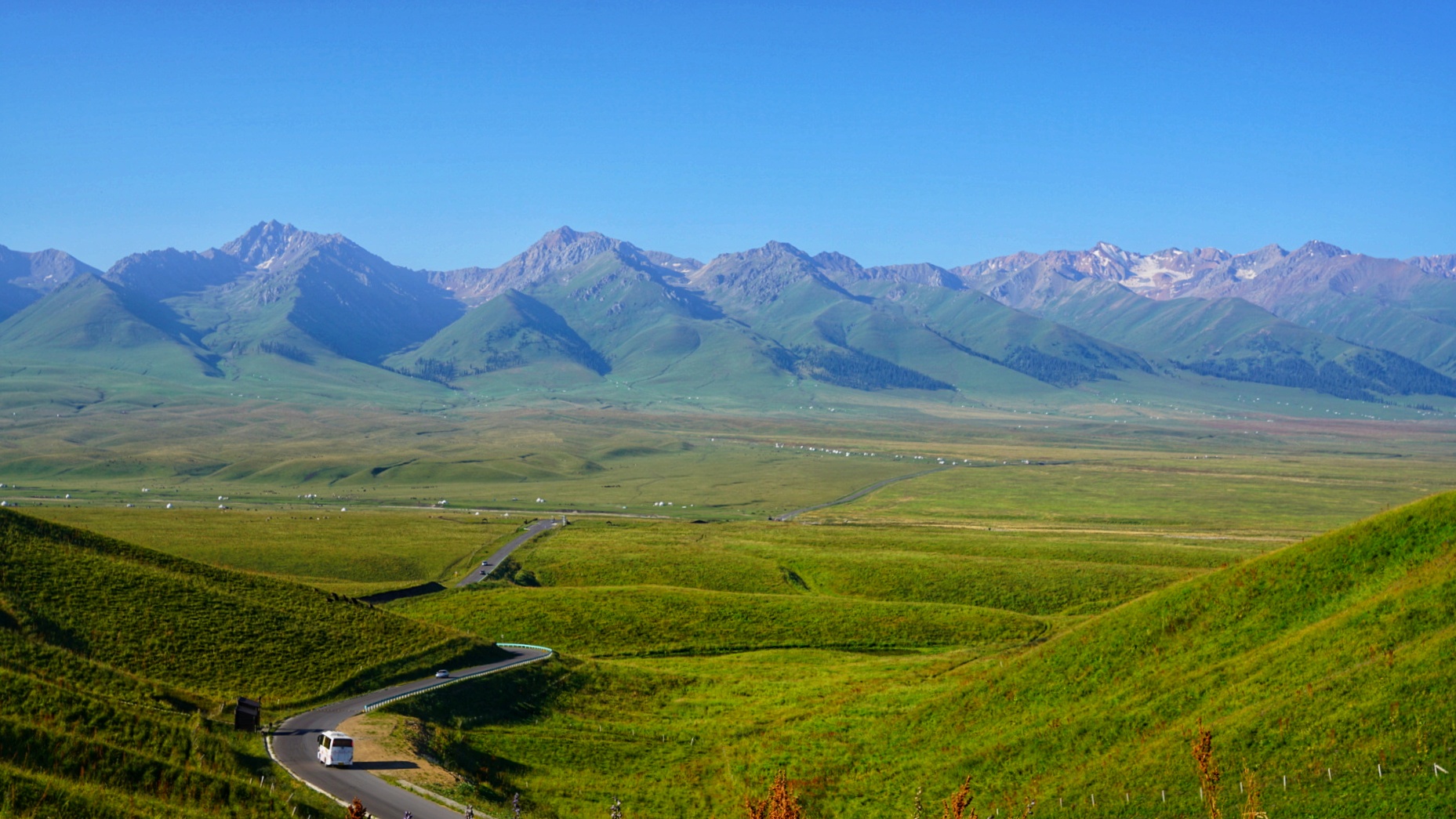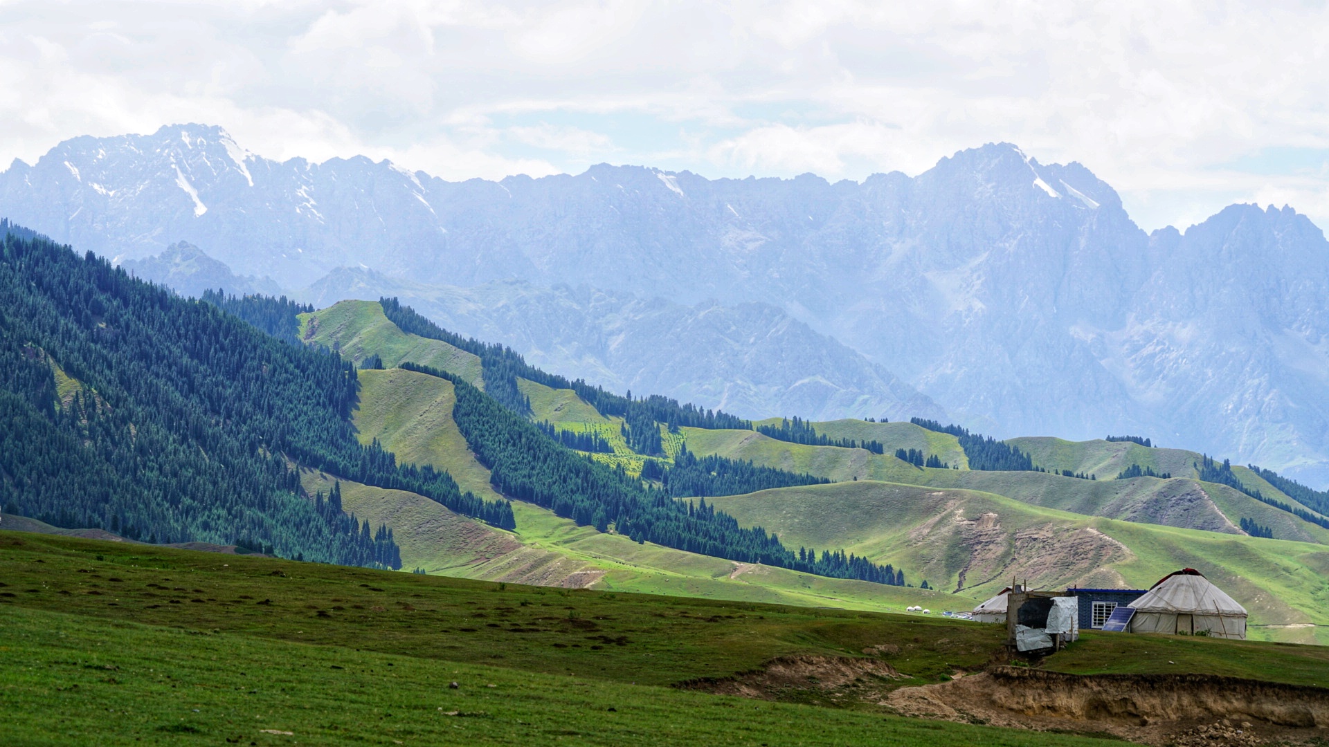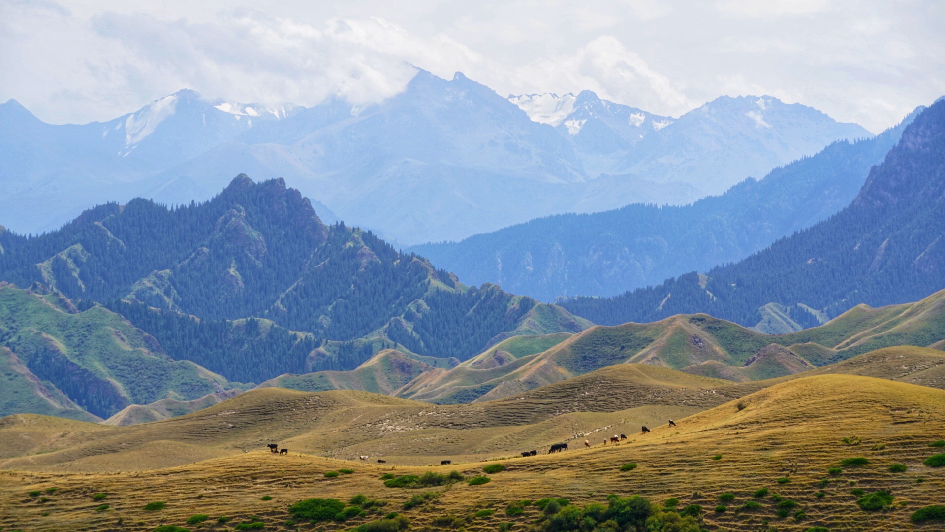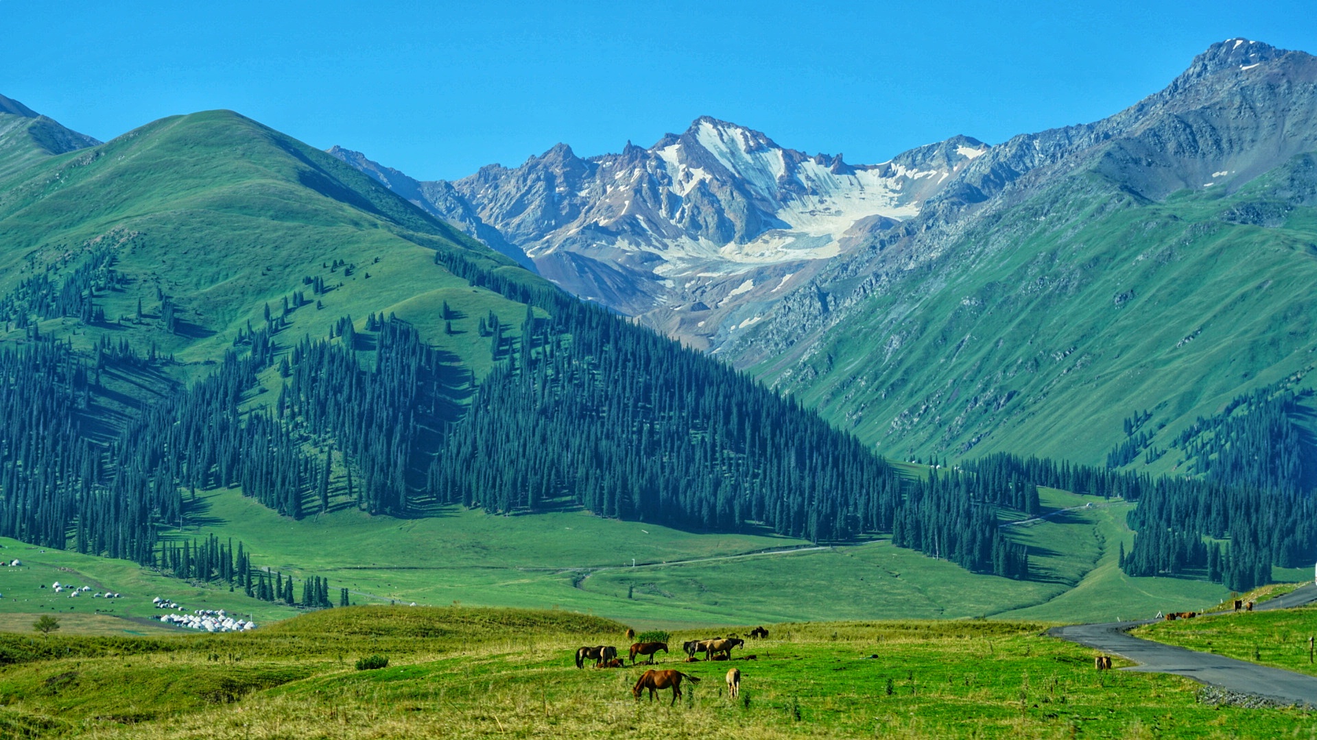 空中草原那拉提,一望无垠的哈萨克族夏季牧场,远处的雪山,草原上的毡房,还有在在草原上悠闲漫步的牛羊,营造出一副天然的放牧图。