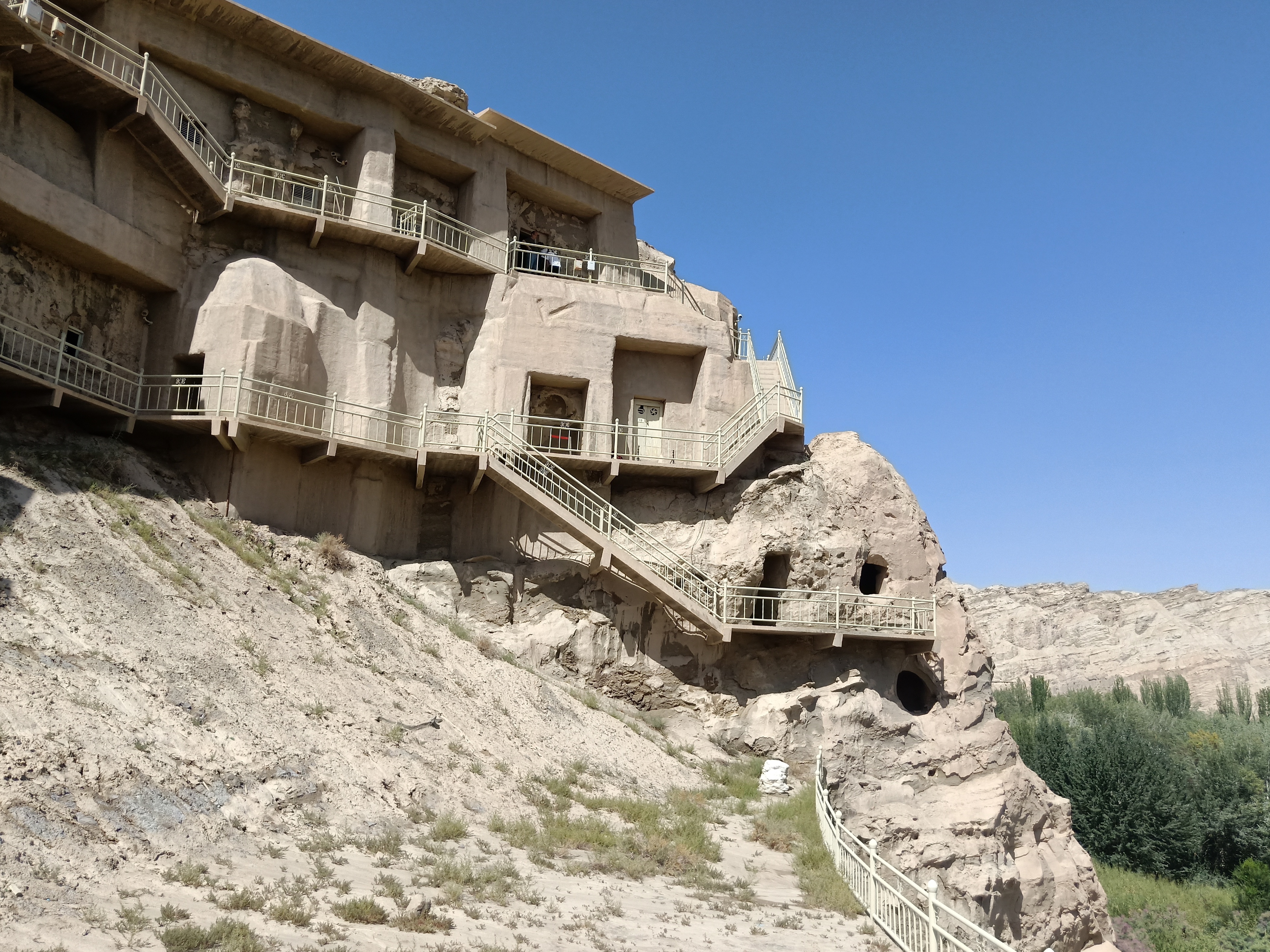 克孜尔石窟又称克孜尔千佛洞或赫色尔石窟,中国佛教石窟,位于新疆拜城县克孜尔镇东南7千米明屋塔格山的悬崖上,南面是木扎特河。