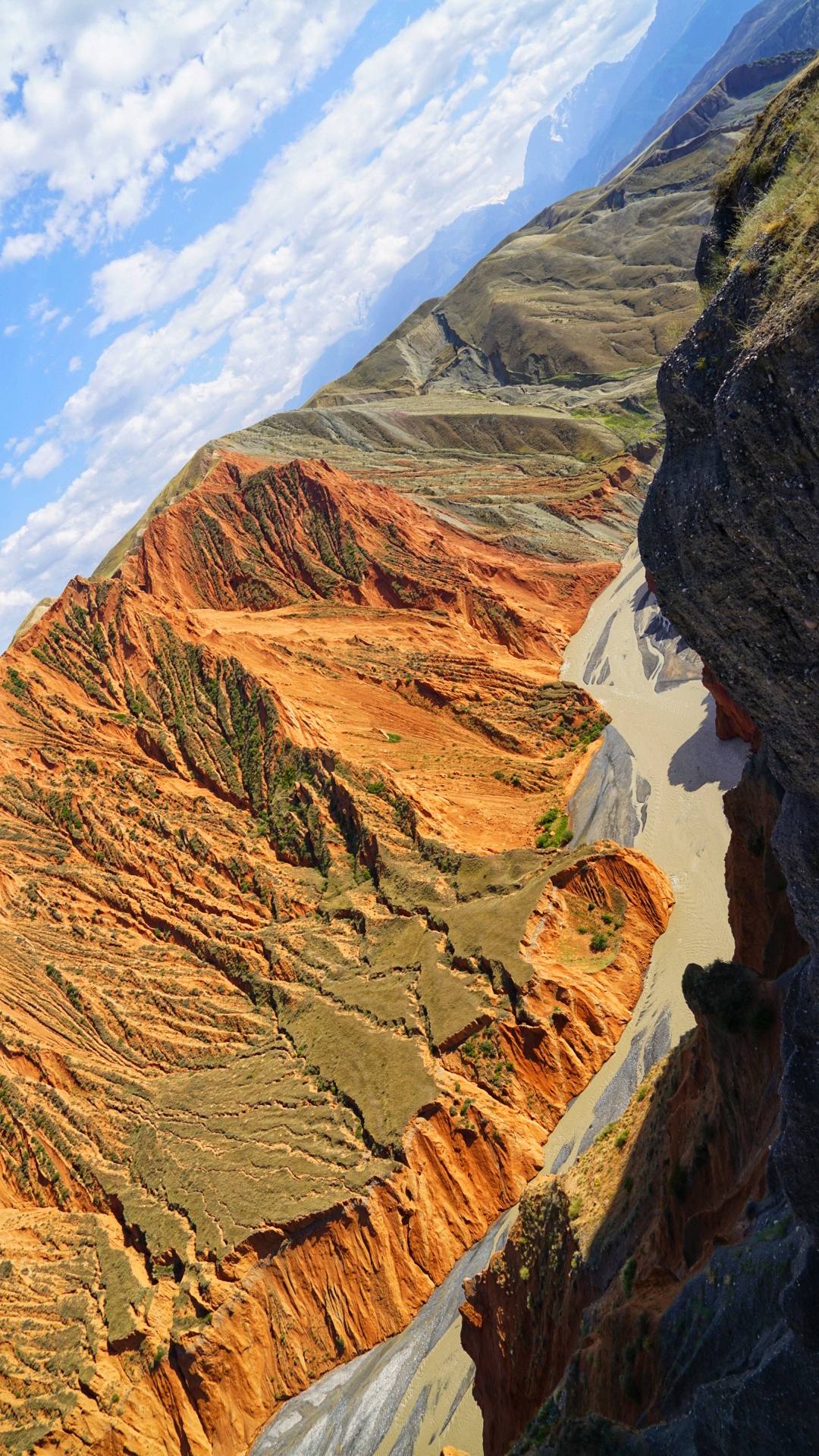 由于独山子大峡谷封闭,领队带我们去了安集海大峡谷,安集海河发源于天山山脉,通过长年冲刷,在天山北坡下形成了规模宏大的冲击扇,河谷冲击扇规模宏大,以伞形向北张开,形成安集海大峡谷,堪称地质奇观。此处非景点,本地人知道也不多,几乎无游人,拍摄危险系数较大,站在山顶往谷底看,背脊发凉。