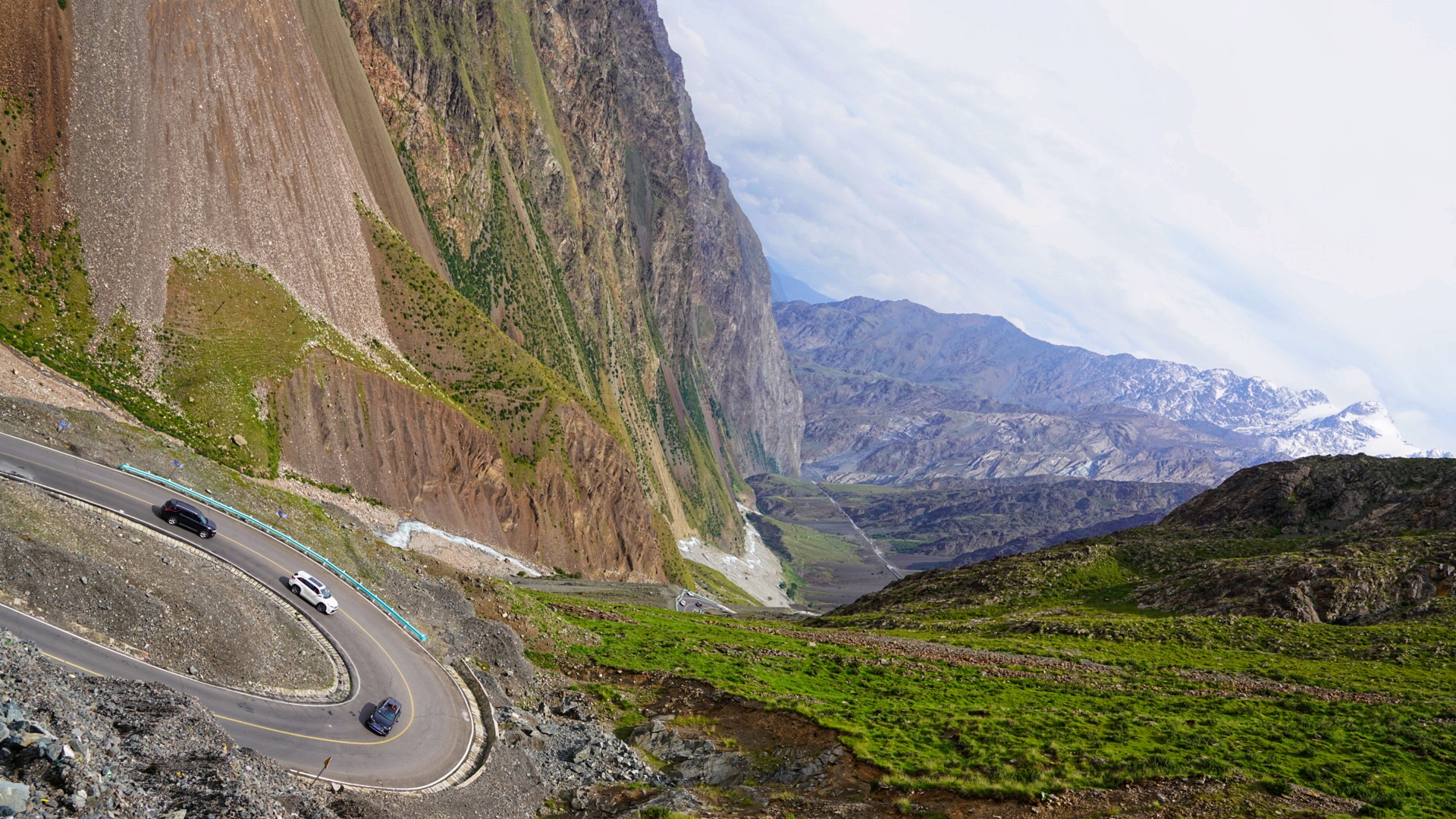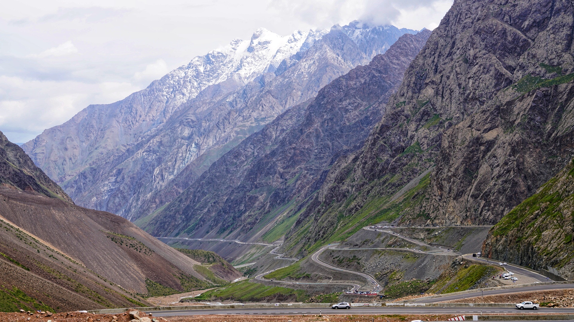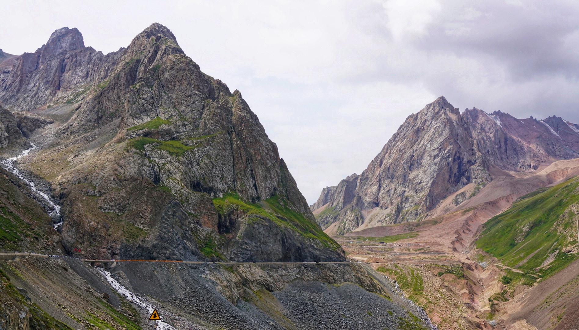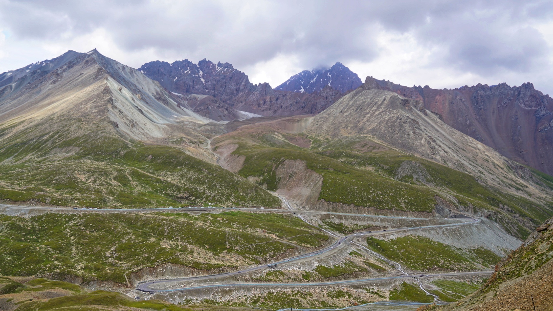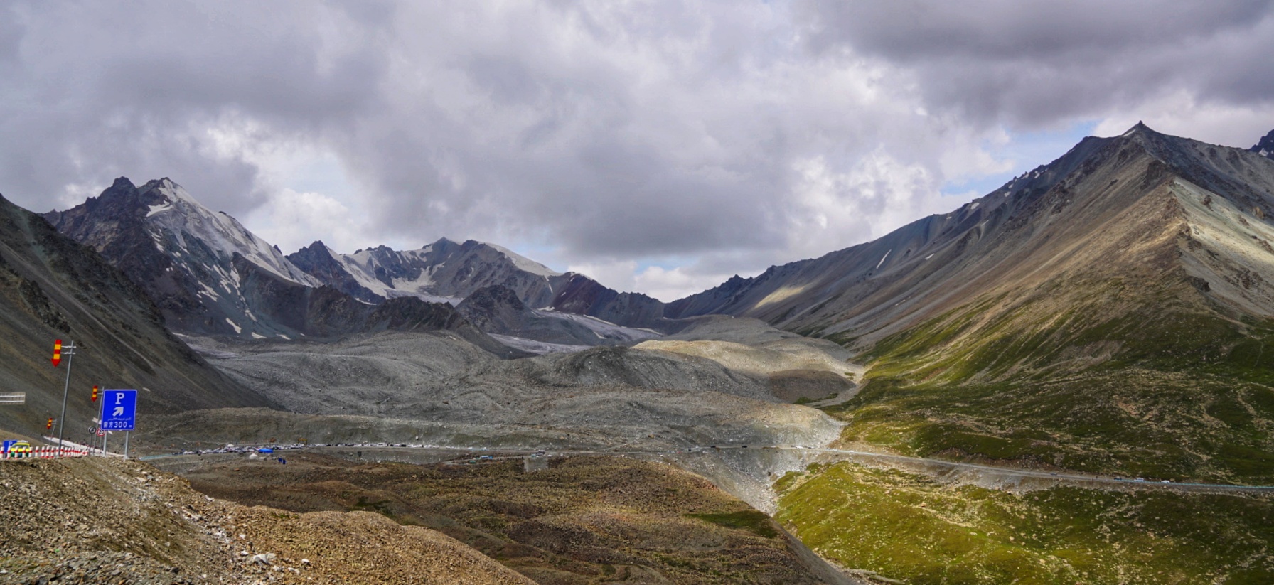 远处的山峰之间就是我们此次独库之行需要翻越的第一座冰打板——哈希勒根打板。