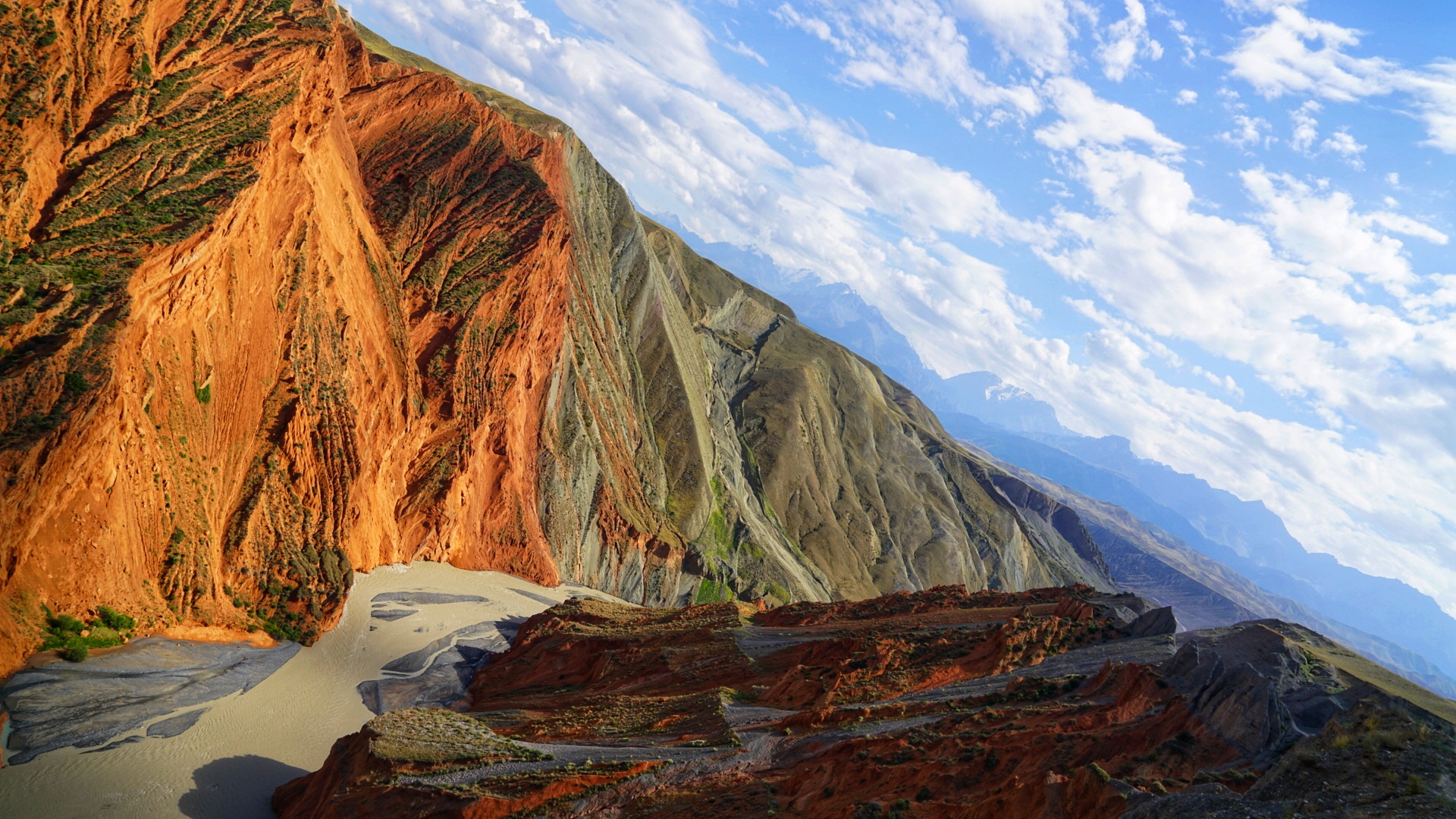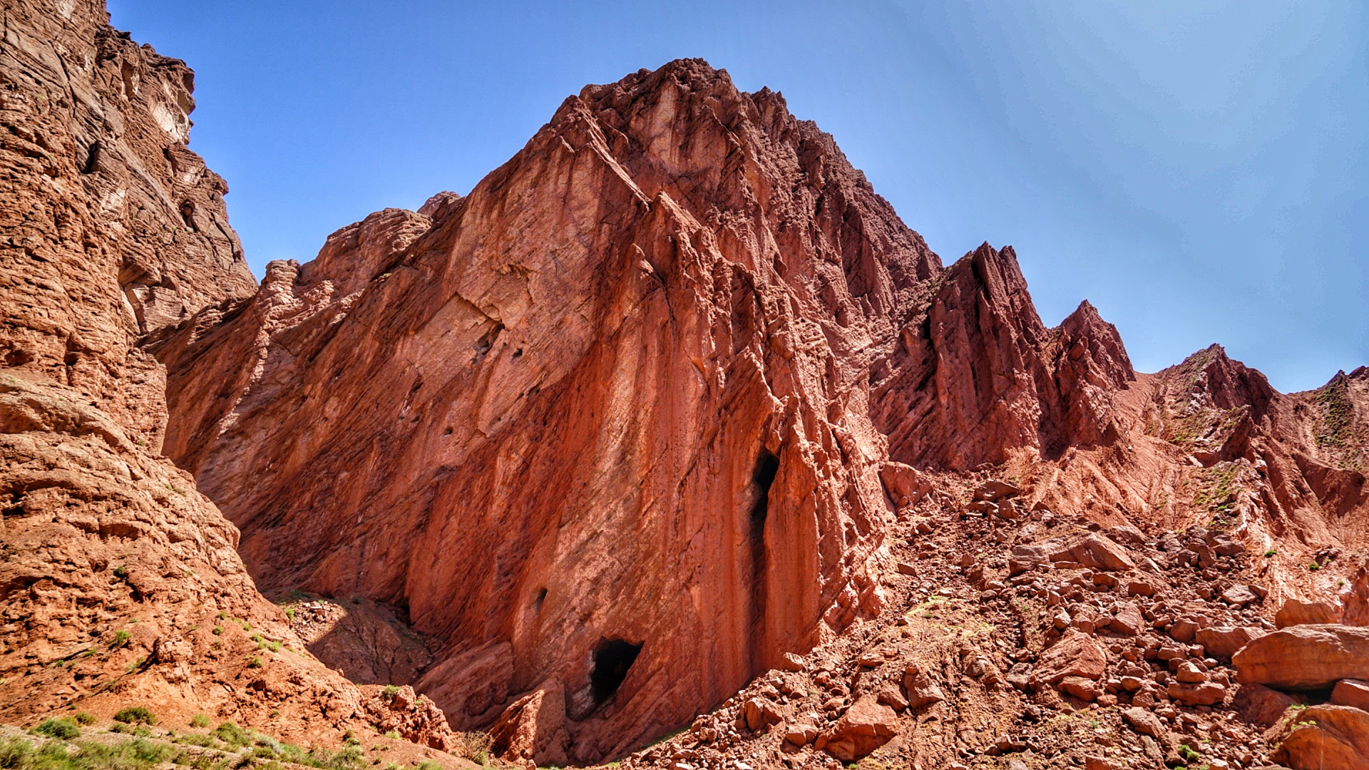 库车大峡谷谷口处的三座山体(乃头山、丽人山、佛面山)最为壮观。特别在夕阳斜射,朝霞映山,极目远眺,色艳红天,大有不是火焰山,胜似火焰山之奇感。