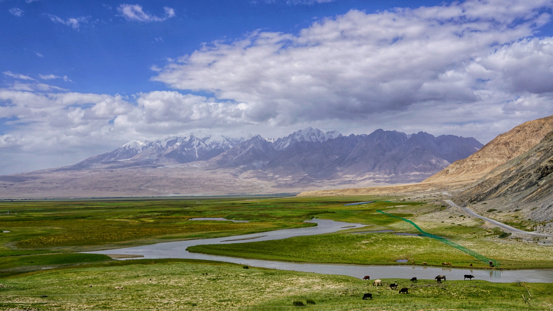 远处的雪山、近处的草地,以及悠然自得的牛羊,构成一副完美的风景画。