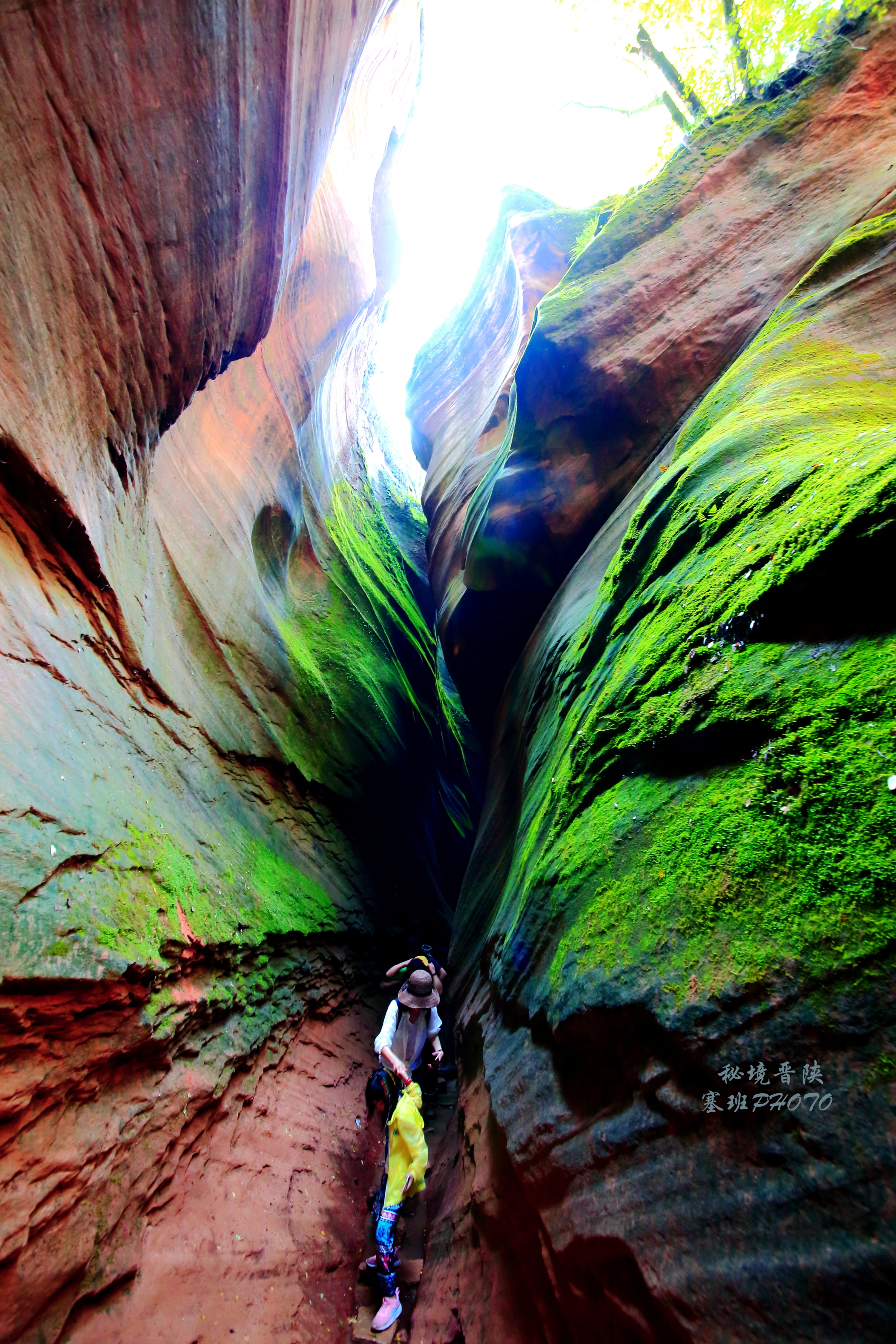 峡谷印象之二,色彩斑斓。峡谷两壁多为红砂岩,亦有石灰岩,一红一灰,对比明显。加之常年阴暗潮湿,绿苔杂生,给一些崖壁上披上春天的外衣。光线从顶部的“一线天”进入,在崖壁上折射,自然生成五色斑斓以正午时分为甚。尽管下午光线弱,感觉如梦如幻,色彩依然可观。