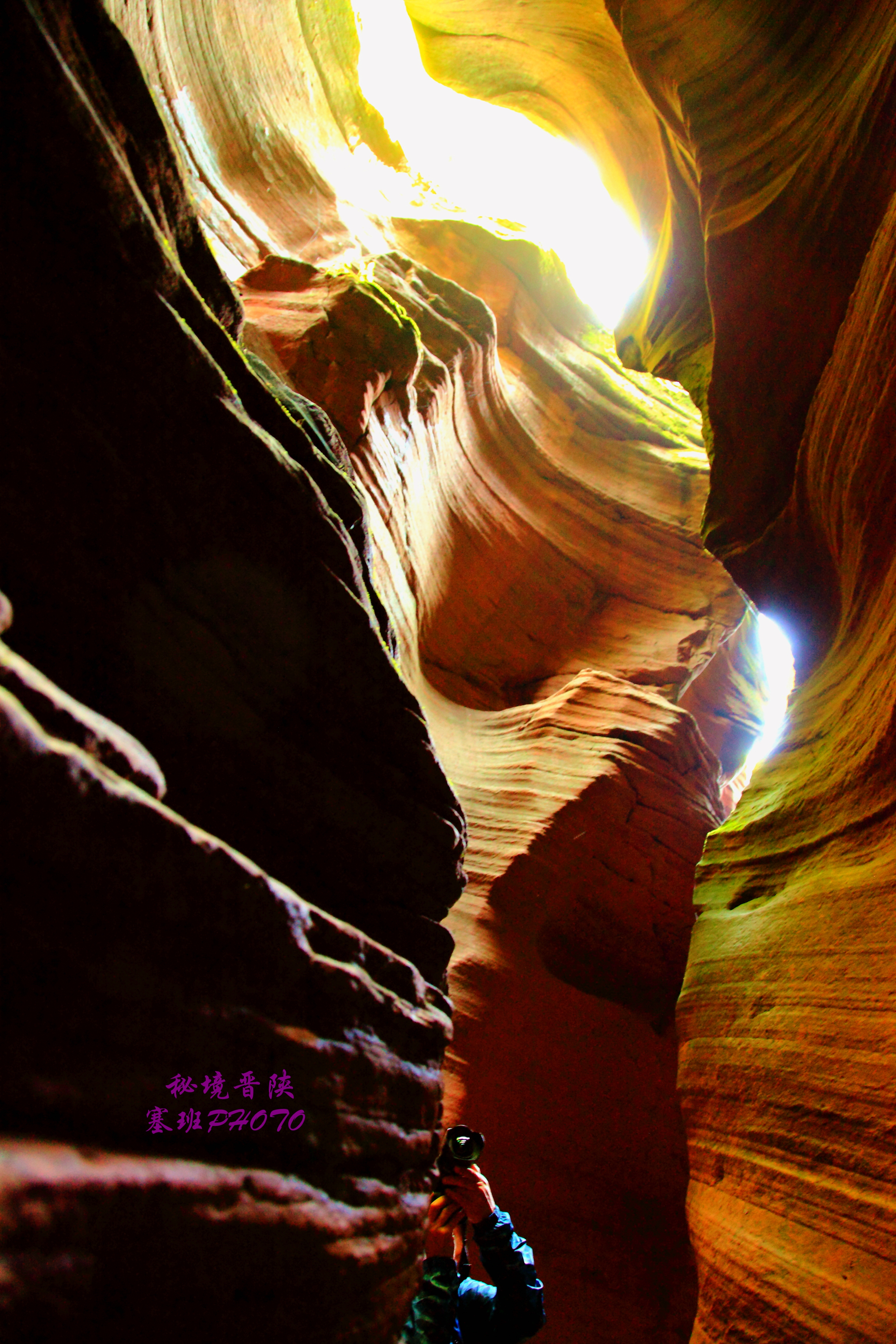走进雨岔峡谷,峡壁凹凸不平、线条流畅,如同波浪从你身边划过,宽的地方几人并排可行,窄的地方只容一人过去。这里如同一个美妙的艺术宫殿,谷壁看似轻柔,实则非常坚硬,岩石表面像被精心打磨过似的,纹层顺着岩壁流淌。阳光从峡谷顶部进入,幻化出奇幻的色彩。如果说水是打造这里奇异形态工匠的话,那么,光就是让它成为美丽景色的魔术师。从头顶射下来的光线,让它时而金黄如泊、时而朱红如砂、时而飘逸流动。在黑暗里站立了千万年的砂岩峡谷,变得无限惊奇,有着道不尽的魅力。走进它,恍若进入另一个空间。晴好的天气在峡谷深处仰望蓝天白云,仿佛是画卷中的点睛之笔,美得不可方物,条条波浪形的线条盘旋而上,直到慢慢变得模糊和天际相接。小的峡谷里蕴藏着自然界无时无刻的独特魅力。天气好的话,可见到峡谷内映衬着多种色彩,像是上帝的双手拂过一般,让你简直不敢相信这是亲眼所见。