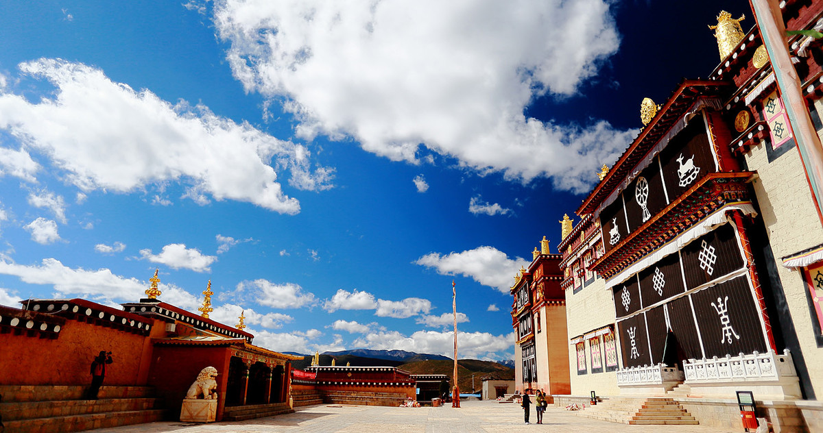 寺院建筑金碧辉煌,造型丰富多彩的镀金铜瓦,殿宇宝角兽吻飞檐,扎仓大殿宽敞恢宏殿,殿中供奉的诸多佛像,两侧西厢的壁画雕饰精美琳琅。