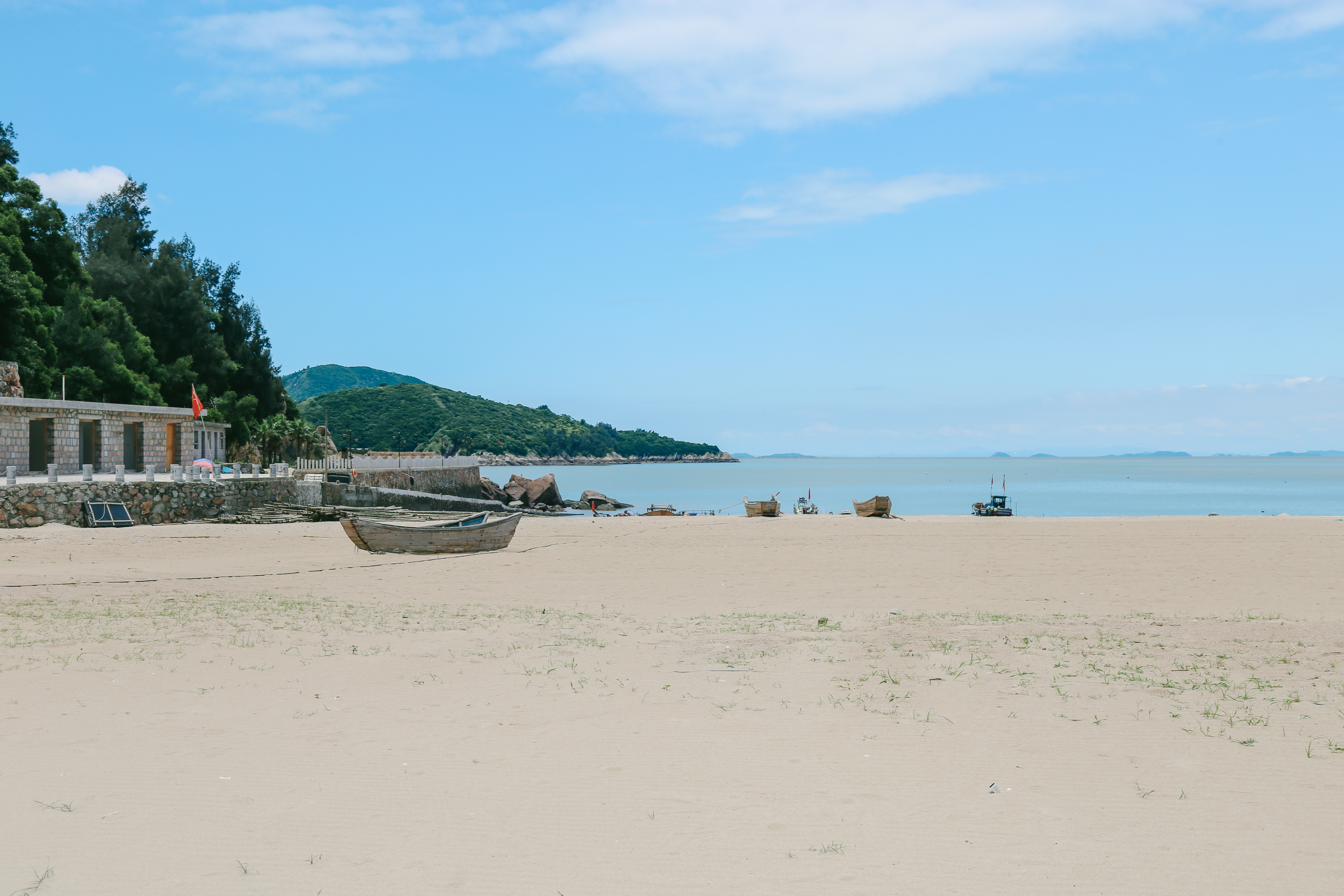 沙子细细软软,泛出浅浅的黄色。海滩上泊着几艘木船,有种岁月静好的感觉。由于不是周末,沙滩上只有零星几个游人,点缀在大自然的风景里。