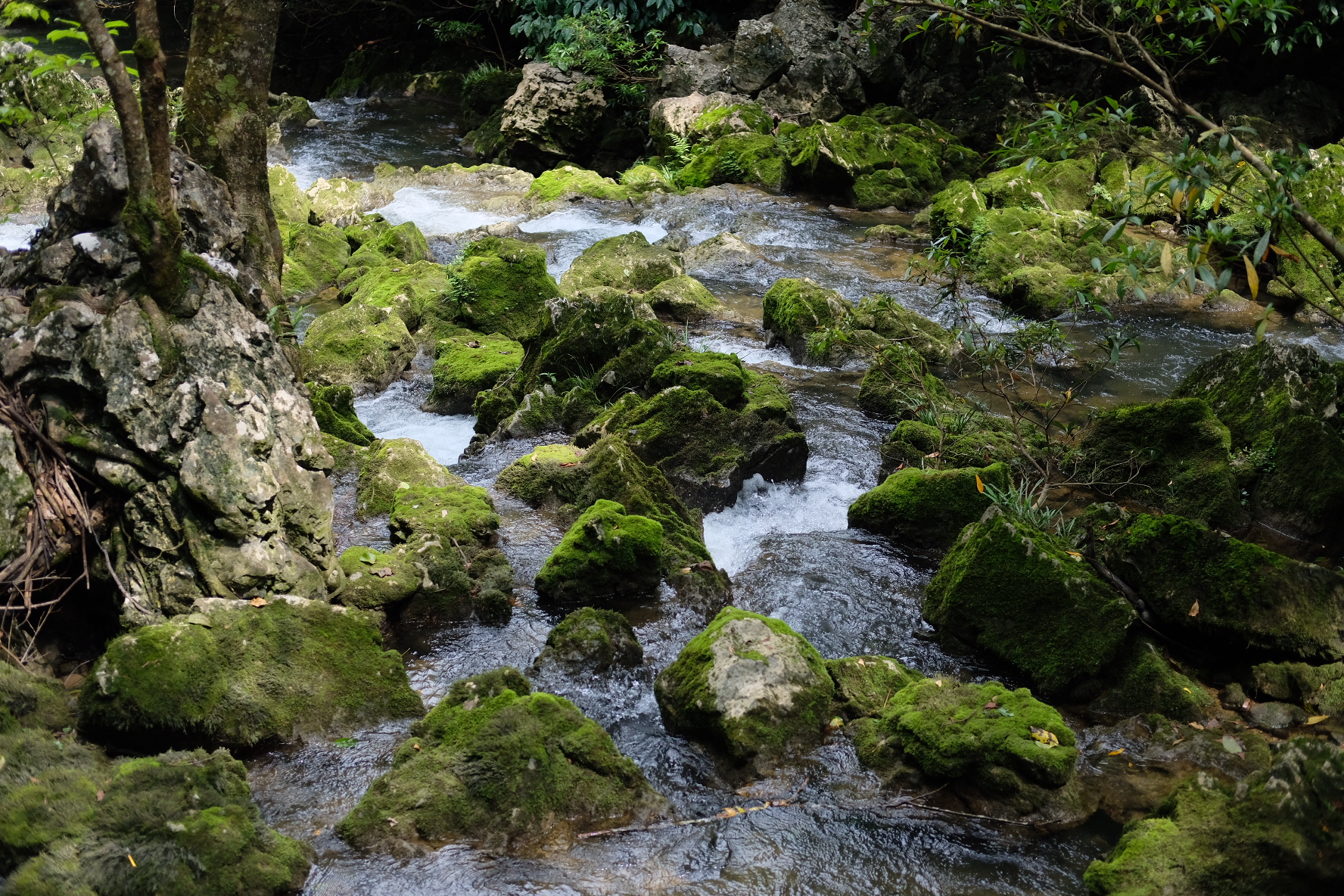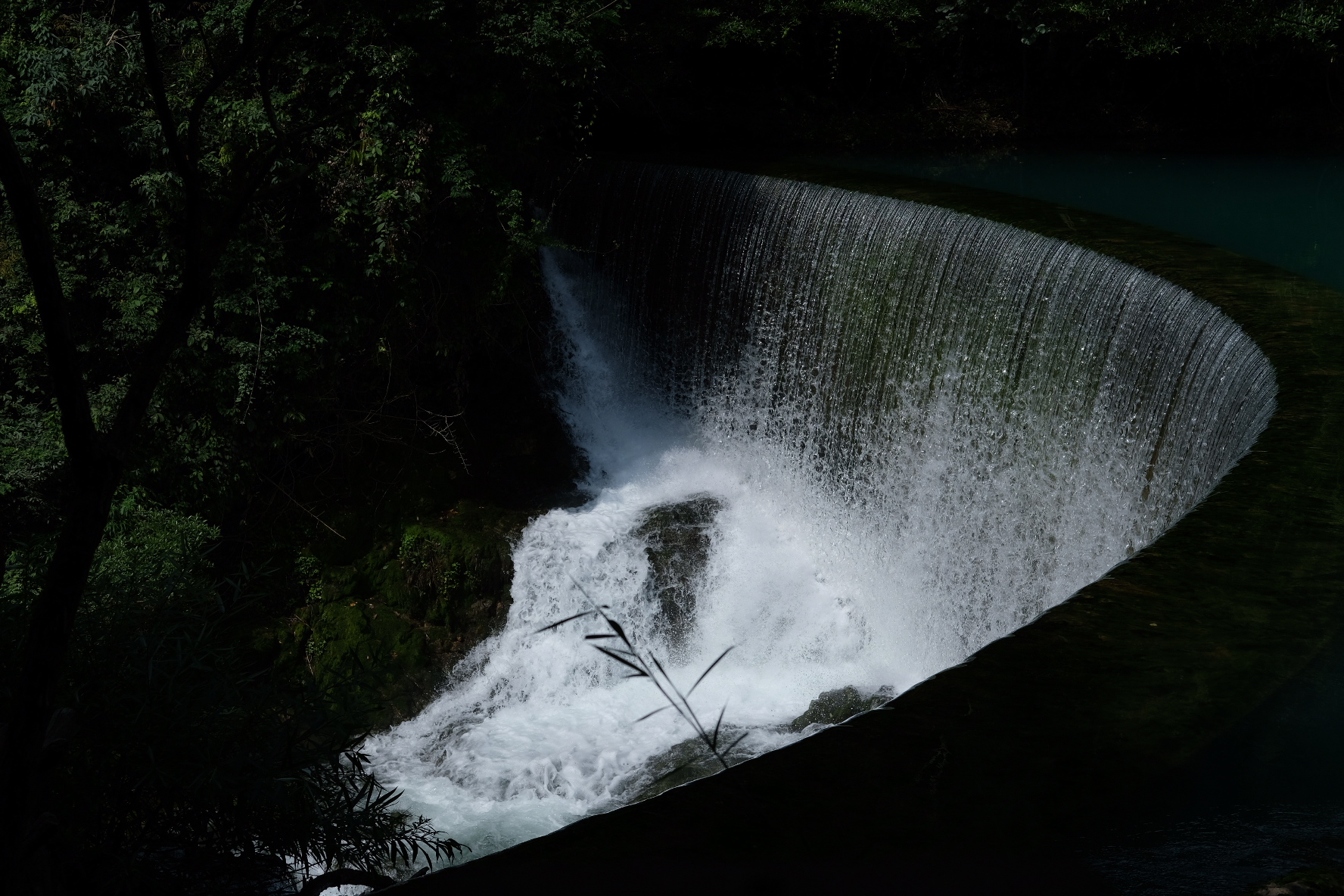 水上森林长约600米,分上下两段。河谷里丛生着茂密的乔木和灌木,形成一道翡翠屏障。清澈的河水从河床的杂木林中穿涌而下。年复一年,日复一日的冲涮,河床已没有了一粒泥沙,连磐石也被激流磨光了棱角而变得“圆滑”起来,但树木却象多情的汉子,死死扎根在河床妻子的怀抱里,纹丝不动。