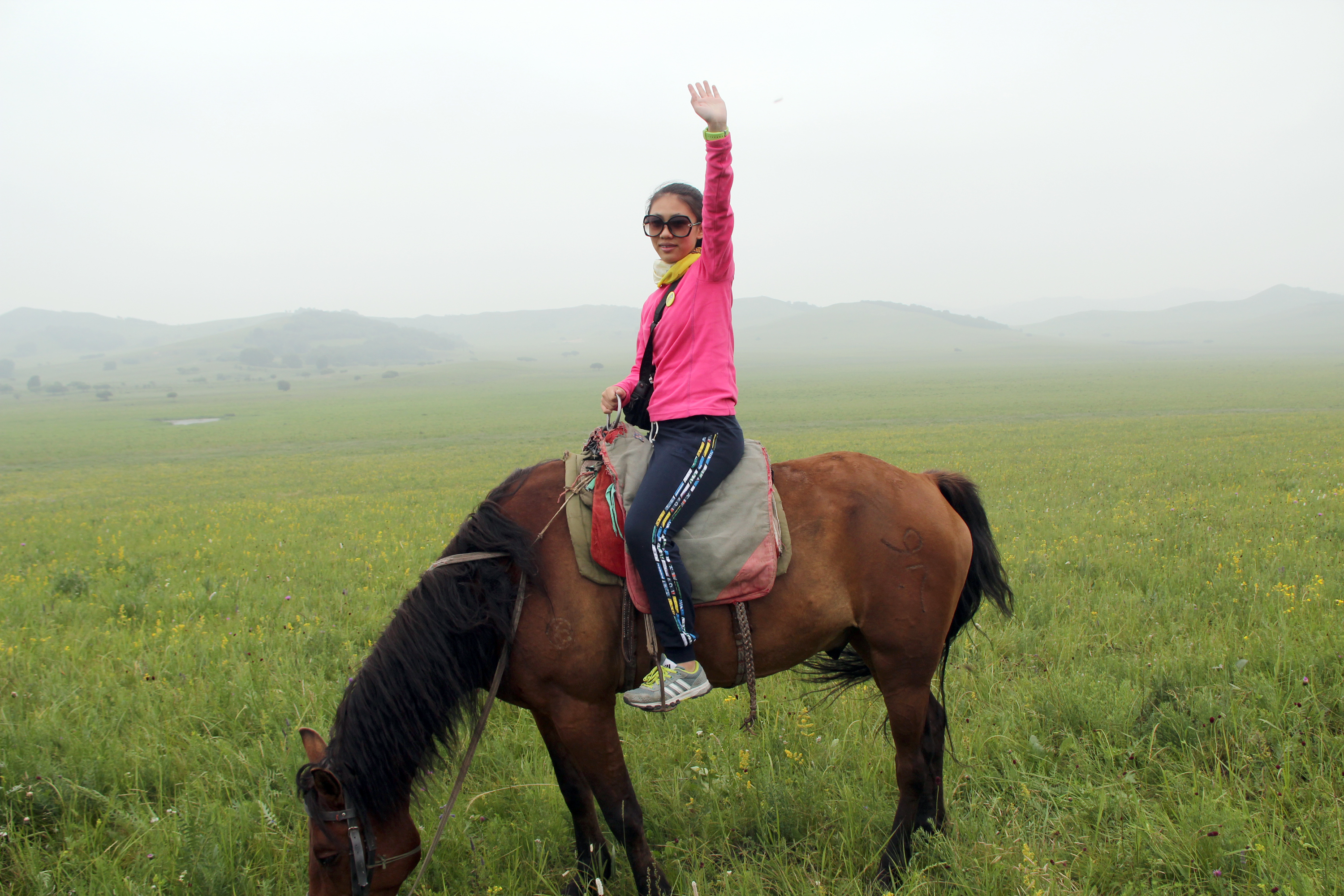 第三天,一早起来就怀着兴奋的心情赶往马场骑马。由于大巴车不能进入草原,我们全部改乘几辆越野车前往马场。马场很大,围了一大群马,黑的、黄的、棕的,可惜没有见到白马。每个人挑了一匹马,因为都不敢单独策马奔驰,只能在牵马人的牵引下,慢慢地前行。渐渐地行入草原深处,眼前是高低起伏、茫茫无边的绿色草坪,大家的心情也开始激荡起来,忍不住策马小跑起来。一边骑马,一边赏景,高兴时跳下马来拍几张照片,在厚厚的草地上打几个滚,尽情领略草原的风情。下午,我们驱车来到白桦林,这是一片错综交错、高低不平的丘陵,山上是成片的白桦林。白桦树全部是野生的,没有任何的人为干预,所以所有的风景都是自然的,让我们体验到大自然的鬼斧神工,创造出不同的比人为更美的景致。这里的白桦树高大,笔直,只在树干顶部有分叉和枝叶。错落有致的白桦林,和地上的花草一起构成了一大幅的水墨画。如果到了深秋落叶缤纷的时候,景色会更美!离开白桦林,我们又去鹿苑观看梅花鹿。刚进入鹿苑,眼前是一大片的草地,长可没过小腿肚,却看不见一只梅花鹿,继续往里面走,才在养鹿员的指引下,在一排长长的围栏前找到一群可爱的梅花鹿。原来它们都蹲在高高的草丛中,一眼看去还真不容易发现。梅花鹿看见游客围过去,并不惊慌,甚至有几只还走近人群,悠闲地吃起小孩子们伸手喂给它们的草料,让大家能够近距离地接触这些草原上的精灵。傍晚回度假村的路上,经常可以看见路边一群群的绵羊,看着它们肥嘟嘟的身躯,加上一天跑下来大伙的肚子都有点饿了,不知是谁提出晚上去吃烤全羊,获得了车上所有人的赞同,于是就让领队康康打电话给度假村的餐厅,提前为我们准备好烤全羊。一回到度假村,大家就迫不及待地赶去餐厅品尝烤全羊。经过炭烤的羊肉外表金黄油亮,香气扑鼻,大家也顾不上形象了,直接上手抓着啃,最过瘾的吃法还是搭配辣椒粉,一口塞进嘴里,外焦里嫩,干酥不腻,咬一口,羊油就顺着皮肉爆发出来,再配上一碗熬成奶白色的羊杂汤,真是绝佳的美味!
