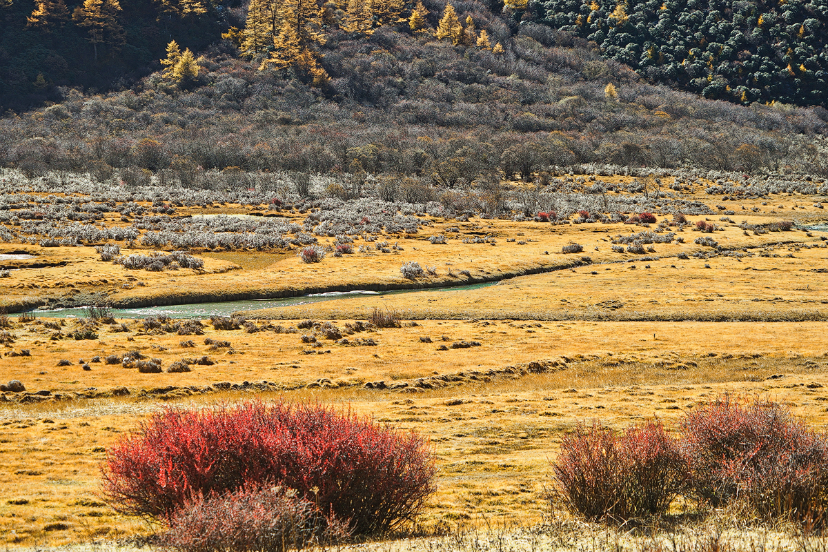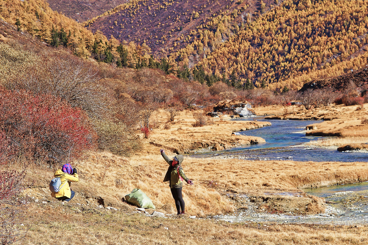 走在洛绒牛场,前面是高昂的央迈勇雪山,周围是一圈金色松树,地上是蜿蜒的 贡嘎 河。我们在山谷之中,四周皆无比壮观啦。