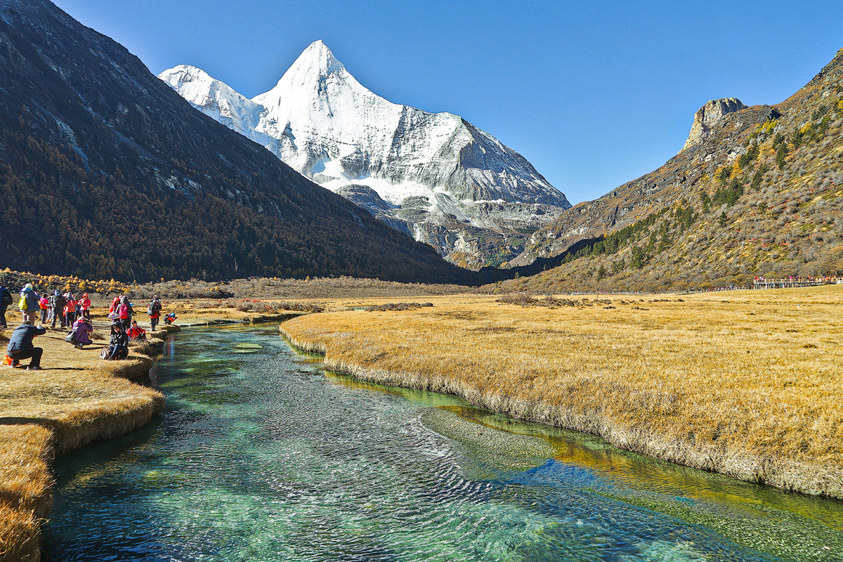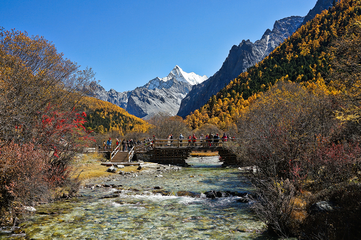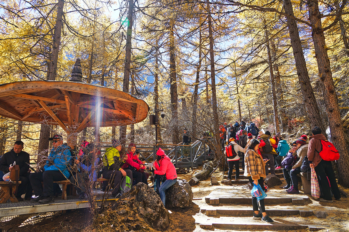 看仙乃日从我们脚下踏着的草坪另一端拔地而起,近得连雪山岩层上的花纹和冰川上的裂隙都清晰可见。深秋,林中的落叶松变为金黄,山杨树变为鹅黄,煞是好看!