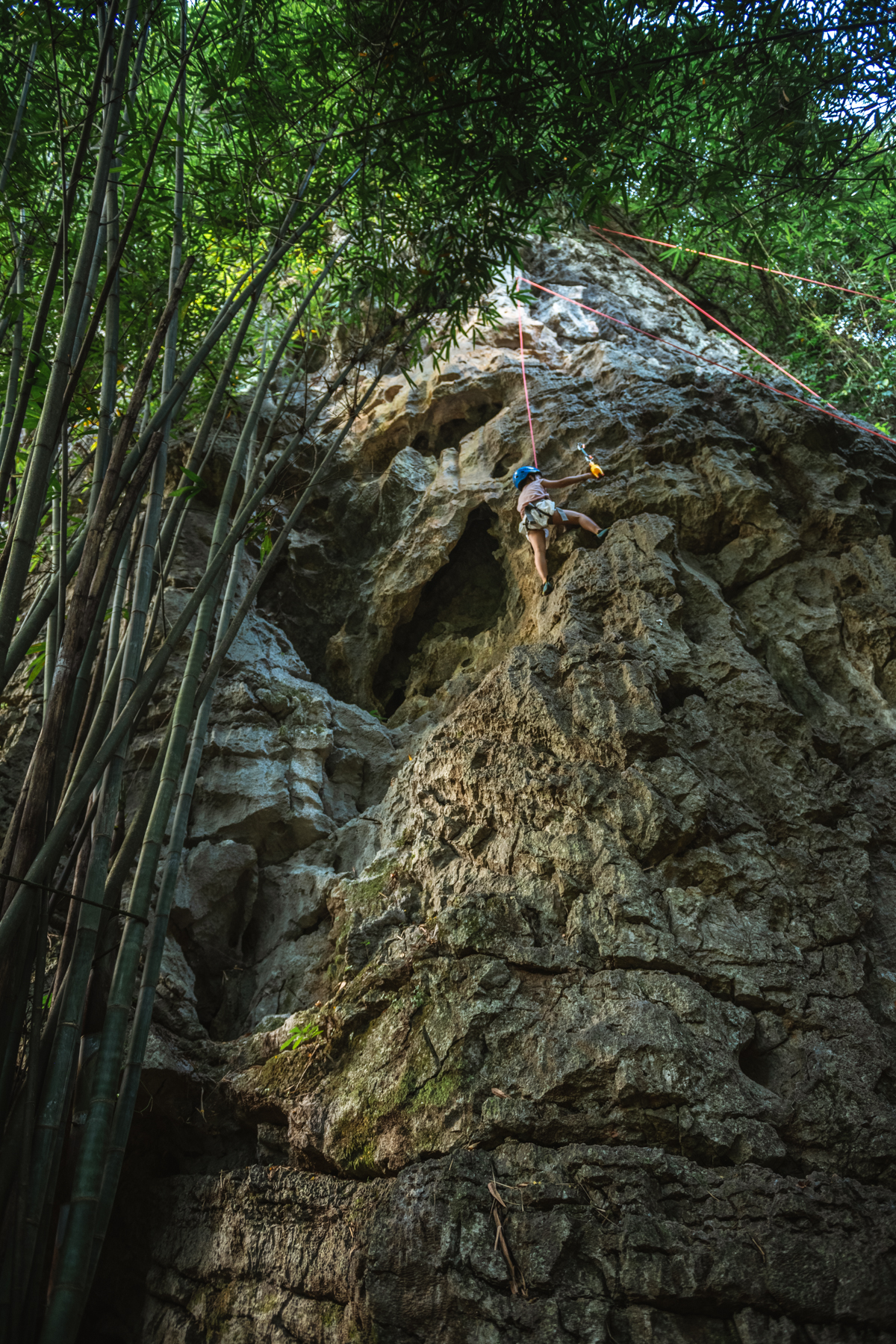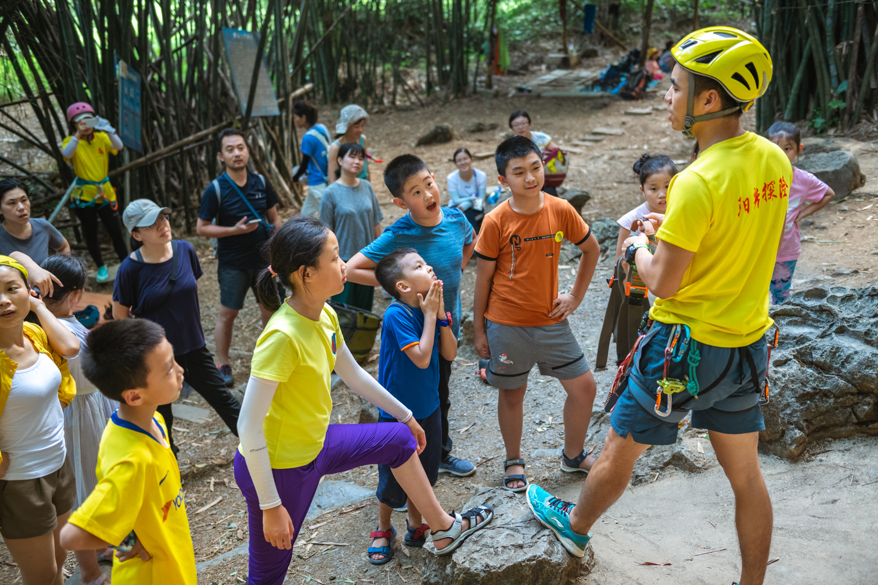 这可不是室内爬塑料墙,是正在意义上攀爬的岩石山,危险系数较高,但在“阳光探险”的工作人员的保护下,一切都顺利进行。