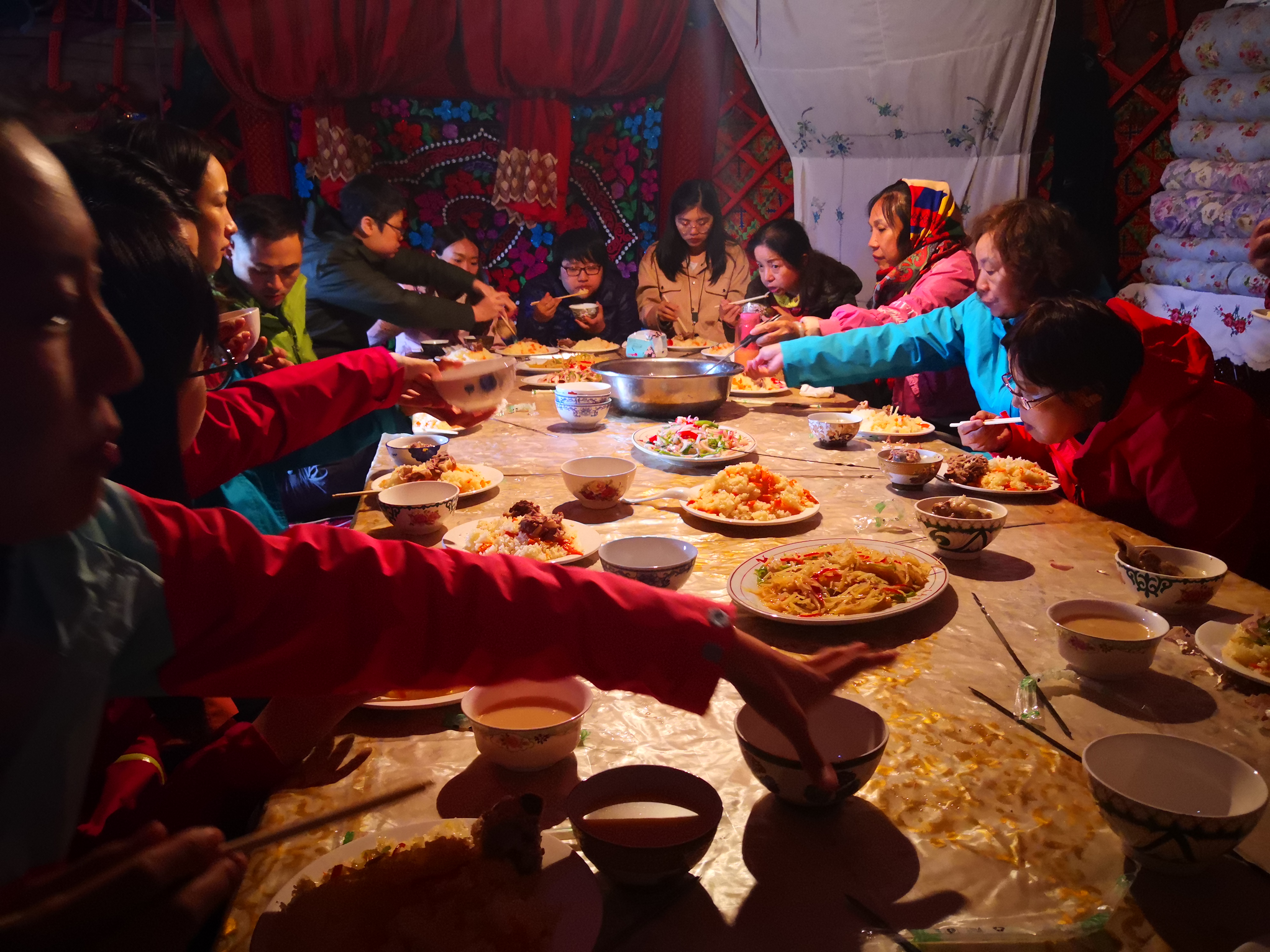 清晨,迎着太阳吃哈萨克族早餐,油饼子,奶茶,土豆丝,凉拌蔬菜~ 饱饱滴! ~~