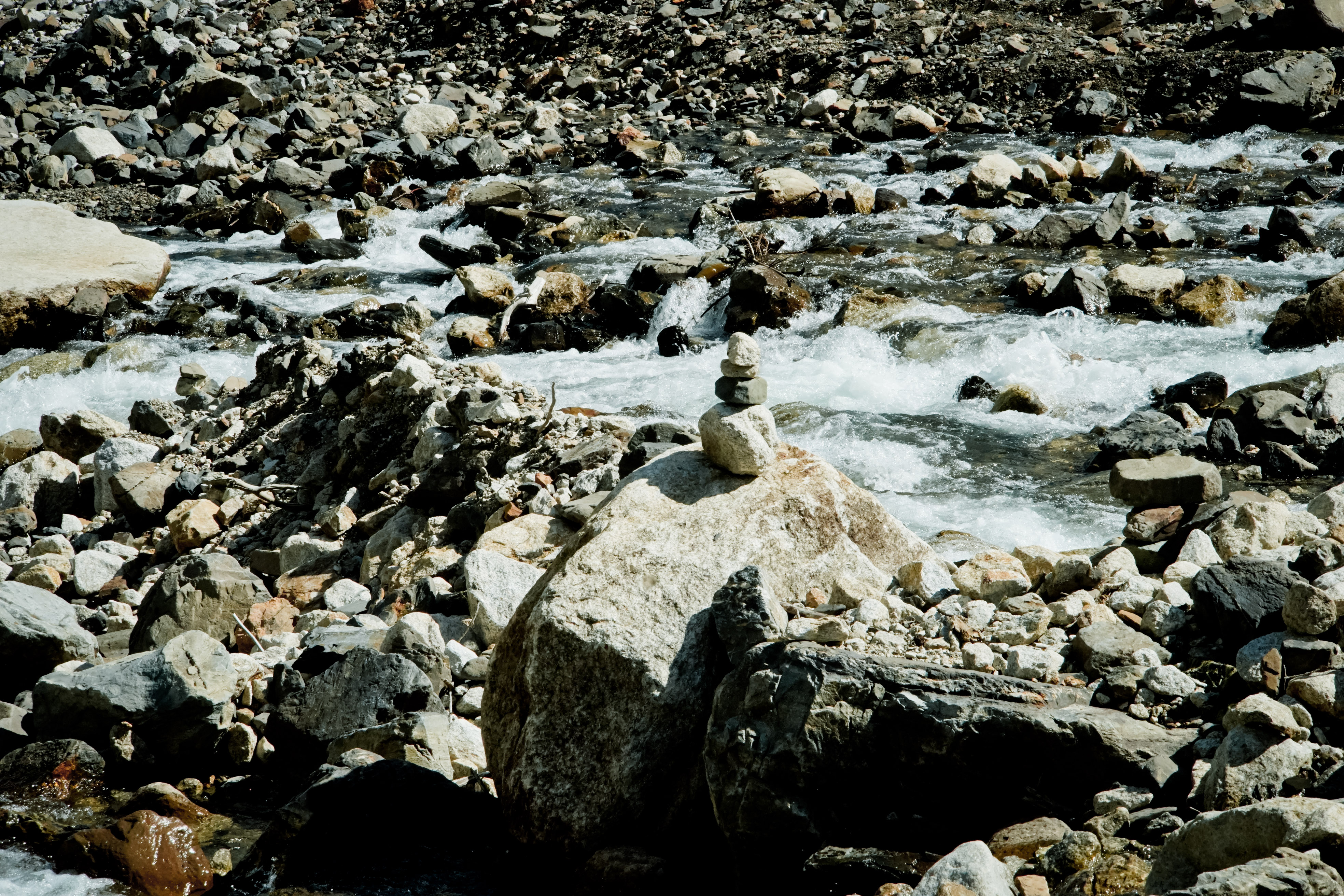 沿着湖边的栈道,可以一路步行到盆景滩,期间还经过一条流水潺潺的溪流,那都是雪山融化之后的雪水,清澈且清凉。