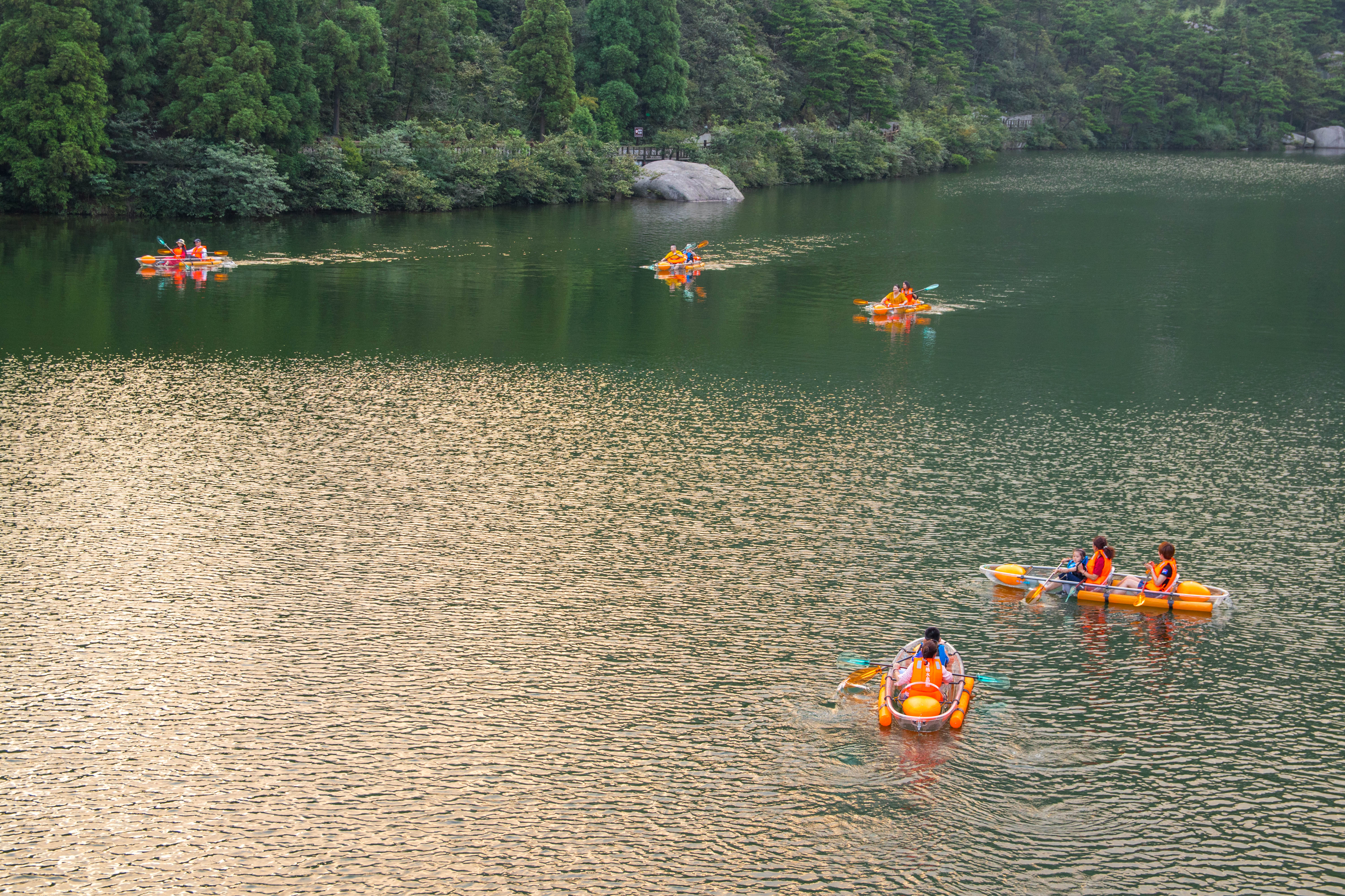 傍晚我们直接下山前往炼丹湖,周围群峰环抱,绿水青山,湖水碧澄,松竹交翠。这么美的景色当然要坐船好好游览一番,湖边就有可供游人乘坐的小船,两个座的水晶小船颜值特别高,全透明的船身,坐进去感觉和湖水融为一体。