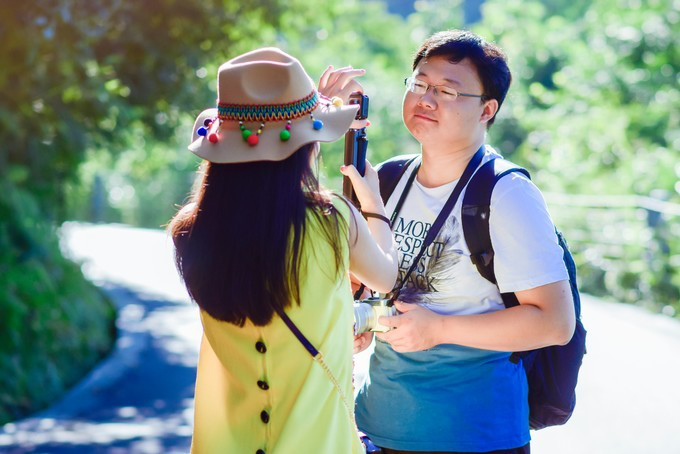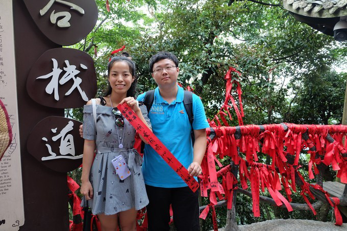 从仙人桥出来,小亦带我们去‘一步难行’,还是那样的台阶,沿途鸟语花香,曲境通幽,我们已经分不清东南 西北 了,如果没有导游的带领,肯定是回迷路的。我们和小亦也熟悉起来了,我已经称呼他‘男神’了。阳光很充足,我们走了大约1个小时,终于到了。只见一座危崖断开,大小并出两块巨石,前面一块长约20米,宽仅2米,是一极佳观景台。但并非所有人都敢站上去一领天子风韵的。因为一道宽仅1米、深临100米的裂缝将二山隔开,唯胆大者可一步跨越前往,大部分游客至此,往往临涧却步。故名“一步难行”。只可惜现在这处危崖上已经牢固的焊上铁箅子,很安全,只能透过铁箅子俯瞰那令人心惊的深崖,一眼望不到底。不知这是不是对风景的破坏呢?