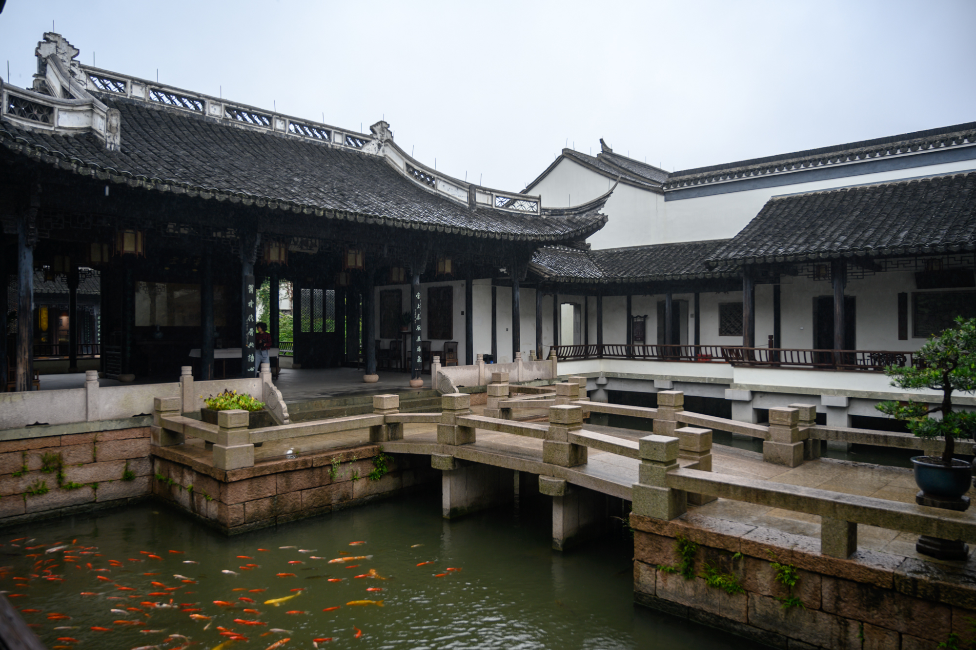 继续往前走,穿过桃李门即来到了金庸书院的正门,门匾上砖刻有“金庸书院”四字,穿门而入一座小石桥及飞檐翘角的建筑映入眼帘,这里就是“书剑堂”,整个书剑堂处于一池碧水之上,细雨飘落在水面上激起淡淡的涟漪,水中游鱼见有人走过争拥而来,尽显古色古香而又充满了活力。