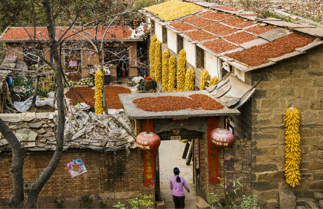 秋季的山楂果晾晒,已经成为山里人多少年延续下来的传统习俗。家家户户门前悬挂堆起的金黄苞谷,一派红火丰收场景。
