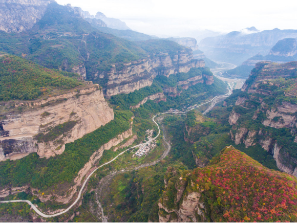 纵贯晋豫,全长20多公里的红岩绝壁大峡谷,是南太行独有景观。宽度5到500米间,深度200米左右,峭壁笔直如削,裸露的红色嶂石岩雄奇壮观,一路弯弯曲曲由河南郭亮直通山西王莽岭。