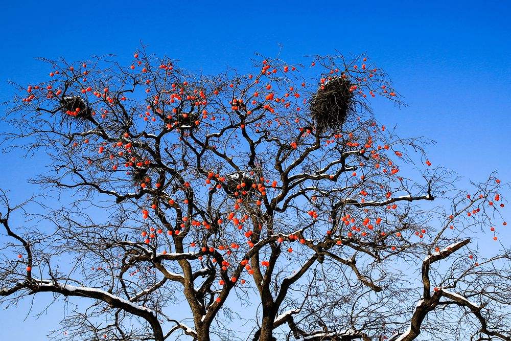 秋季的太行山,除了层林尽染、绵延无尽的斑斓美景,还有山里乡亲们收秋晒秋的忙碌身影。太行山盛产山柿子,每到秋季,山里一树又一树的柿子红彤彤挂满枝头,乡亲们趁着柿子还没软就采摘下来,开始每年一季的传统手工劳作:去皮、悬挂、晾晒、出霜,做成美味的柿饼。