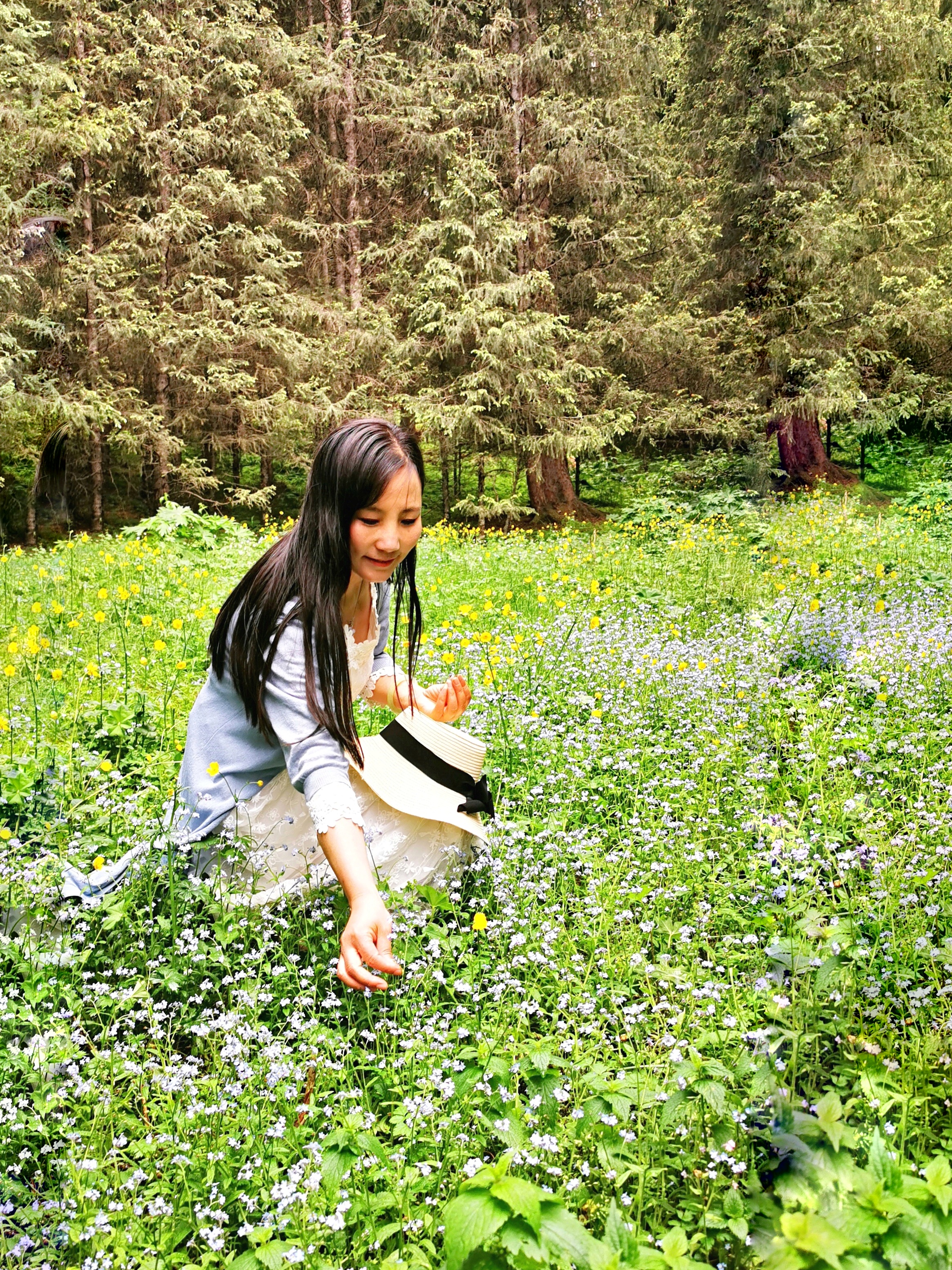 雨帘初敛,阳光便穿过云的罅隙闪射下来,从雪岭云杉林掩映的枝叶间筛落,投下的斑驳光影镀亮了林间那一片片淡蓝与金黄的花海!我惊呼着,张开双臂去拥抱云杉粗直的老干;我哼唱着,踏着凋落的针叶铺成的厚毯手舞足蹈;我微笑着,随手采撷一簇蓝色的勿忘我,别在发间,喃喃道:“我永远也不会忘记你!”