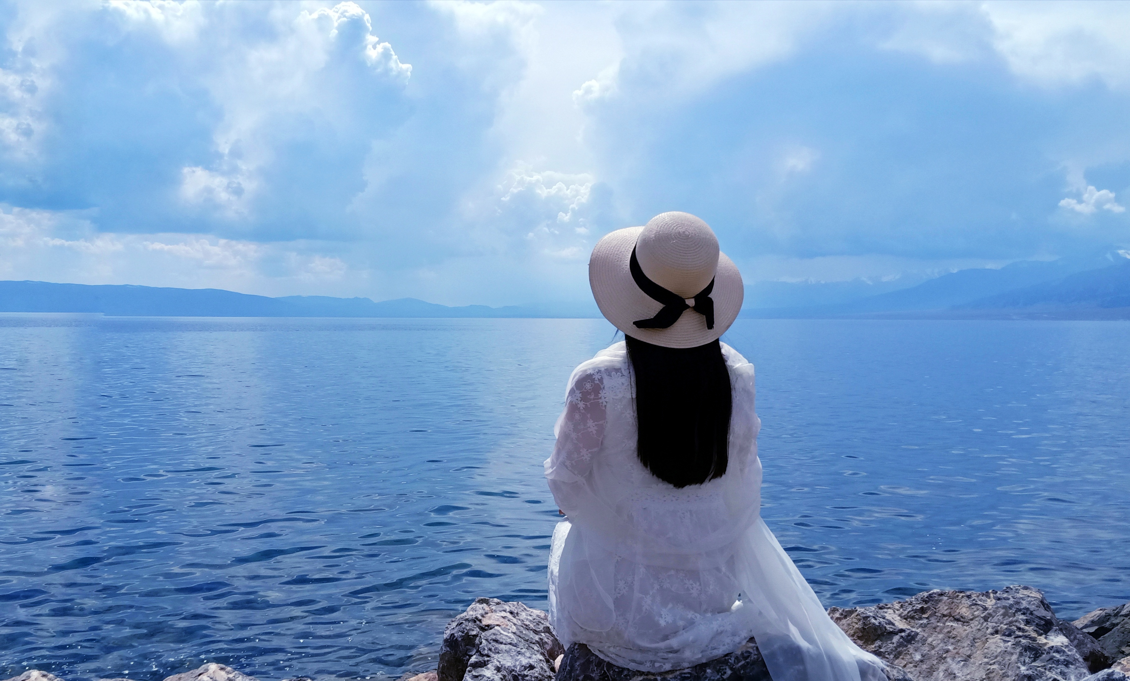 放眼望去,湖面上既没有如织的游船画舫,也没有苇绿荷红,更没有鱼跳鸭喧……只见那蓝莹莹的湖面与黛蓝的远山,青白色的云朵融为一体。水面鳞波微漾,如一匹揉皱的蓝色锦缎铺展着。近岸的水波,有节奏的轻击着碎石,腾起一朵朵洁白的细浪,盛开在你的脚下。