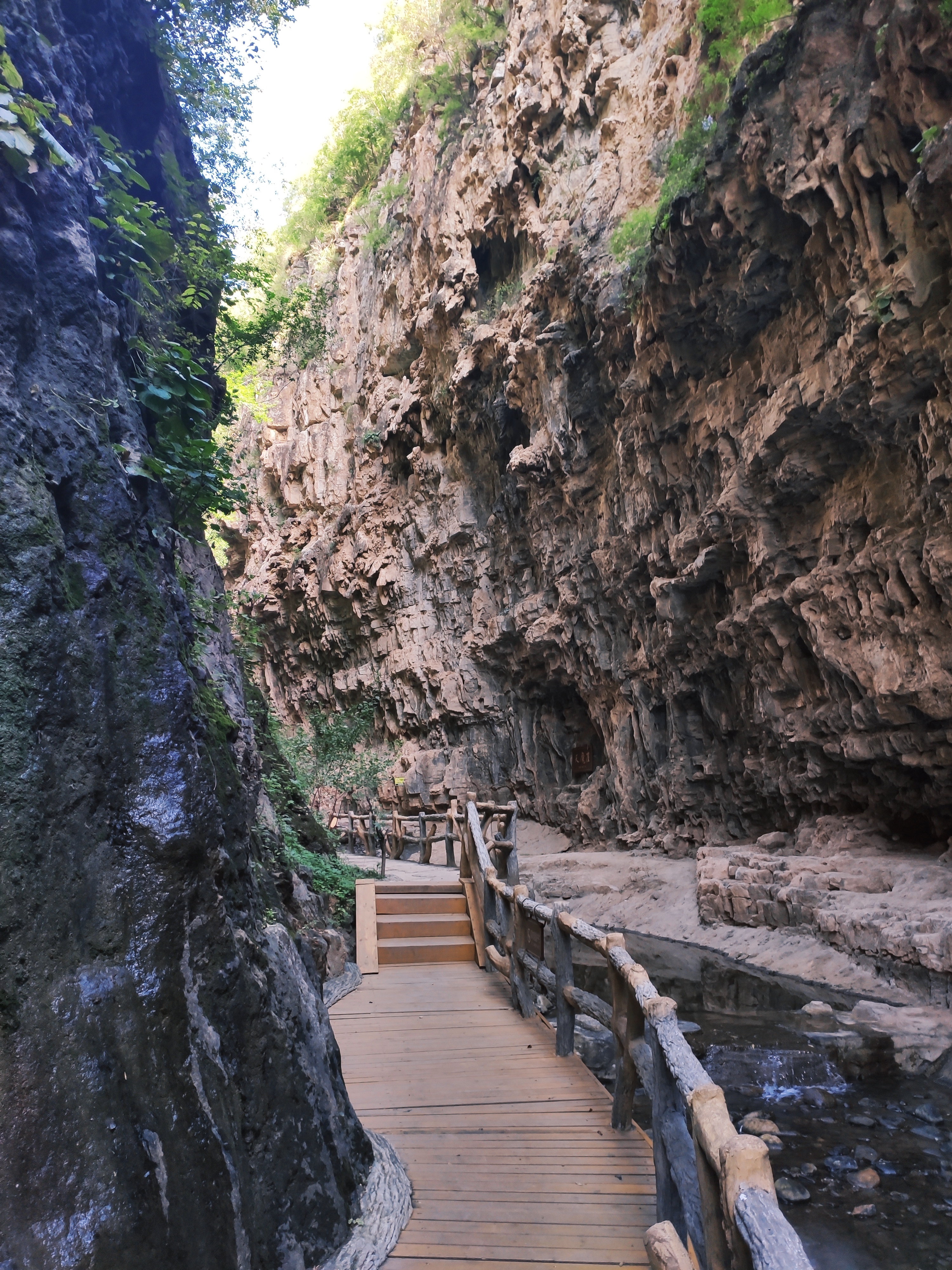 一线天,因两壁夹峙,缝隙所见蓝天如一线而得名。峡谷内有山泉流过,两侧岩壁以喀斯特风貌为主,由于太阳直射谷内时间短,所以环境清凉湿润,水汽较大。