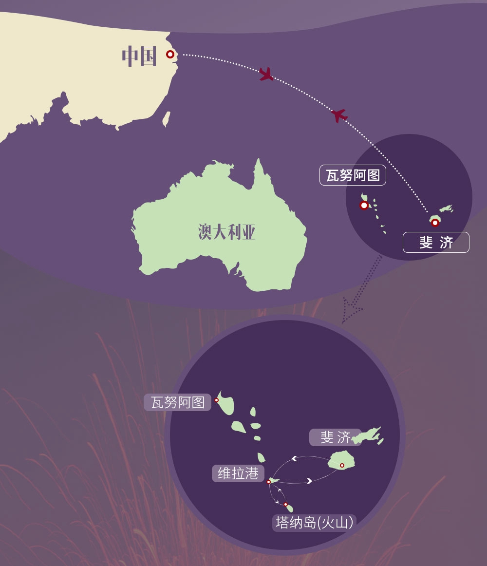 从国内去瓦努阿图,建议与澳洲或斐济一起玩,否则交通太辛苦。国内大城市有直飞悉尼和布里斯班的航班,可以少转机。香港有直飞斐济的航班,其他城市都需要香港或首尔转机。