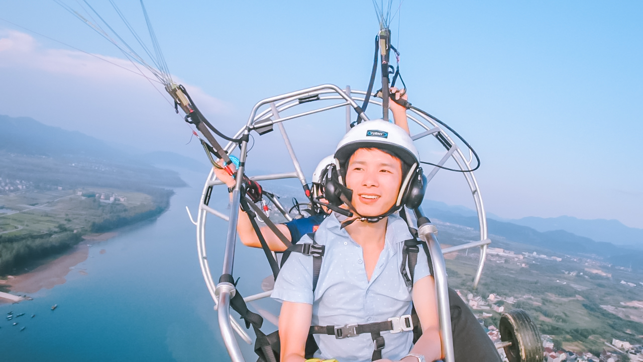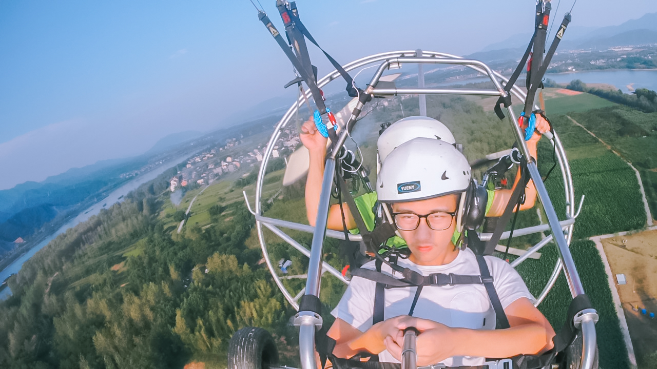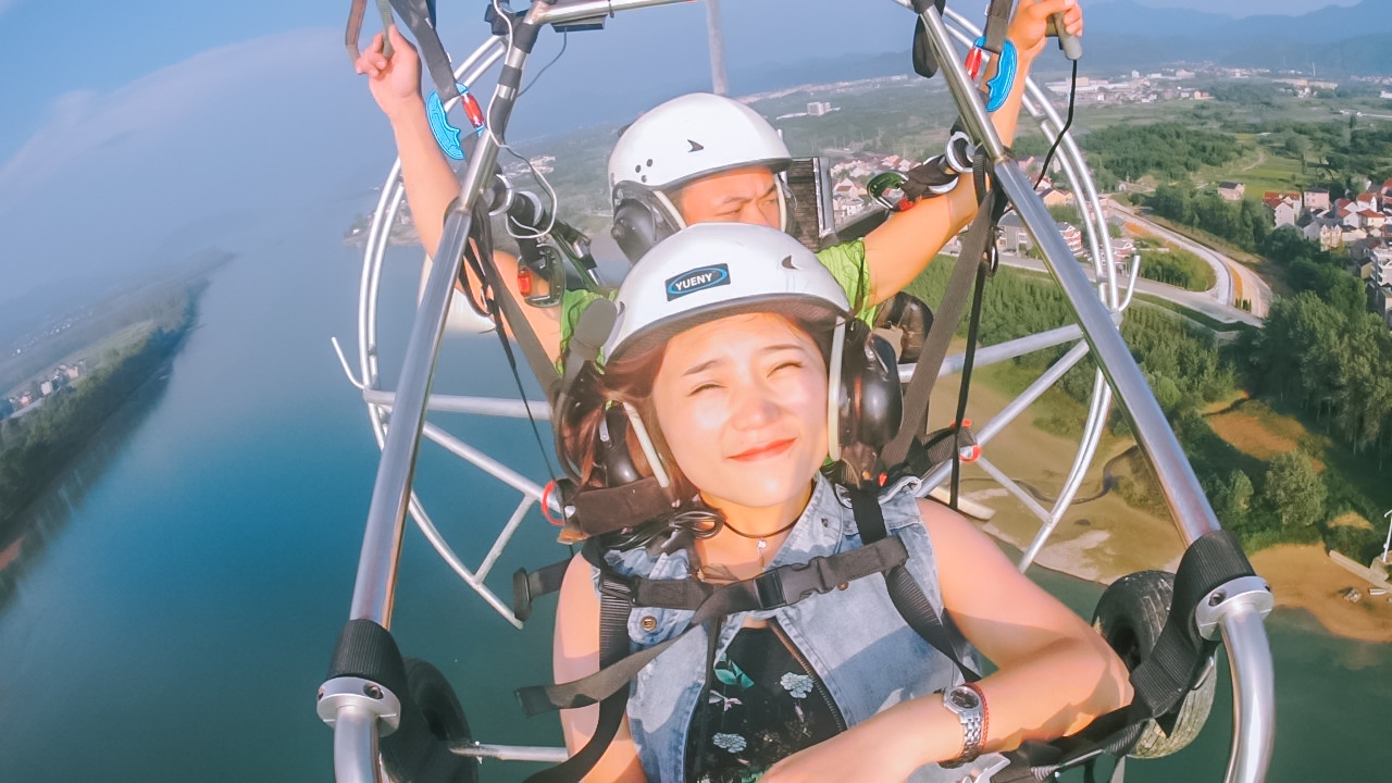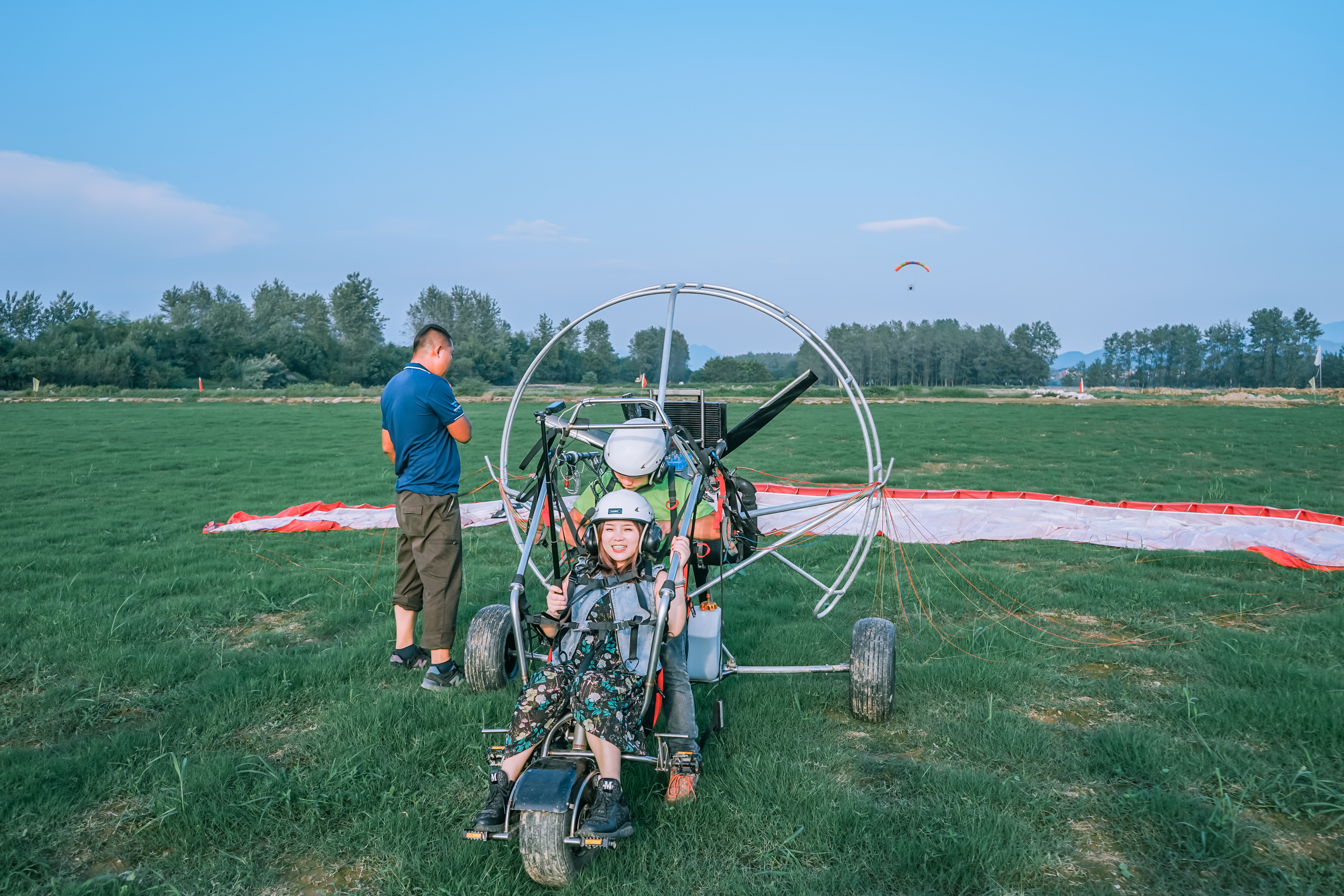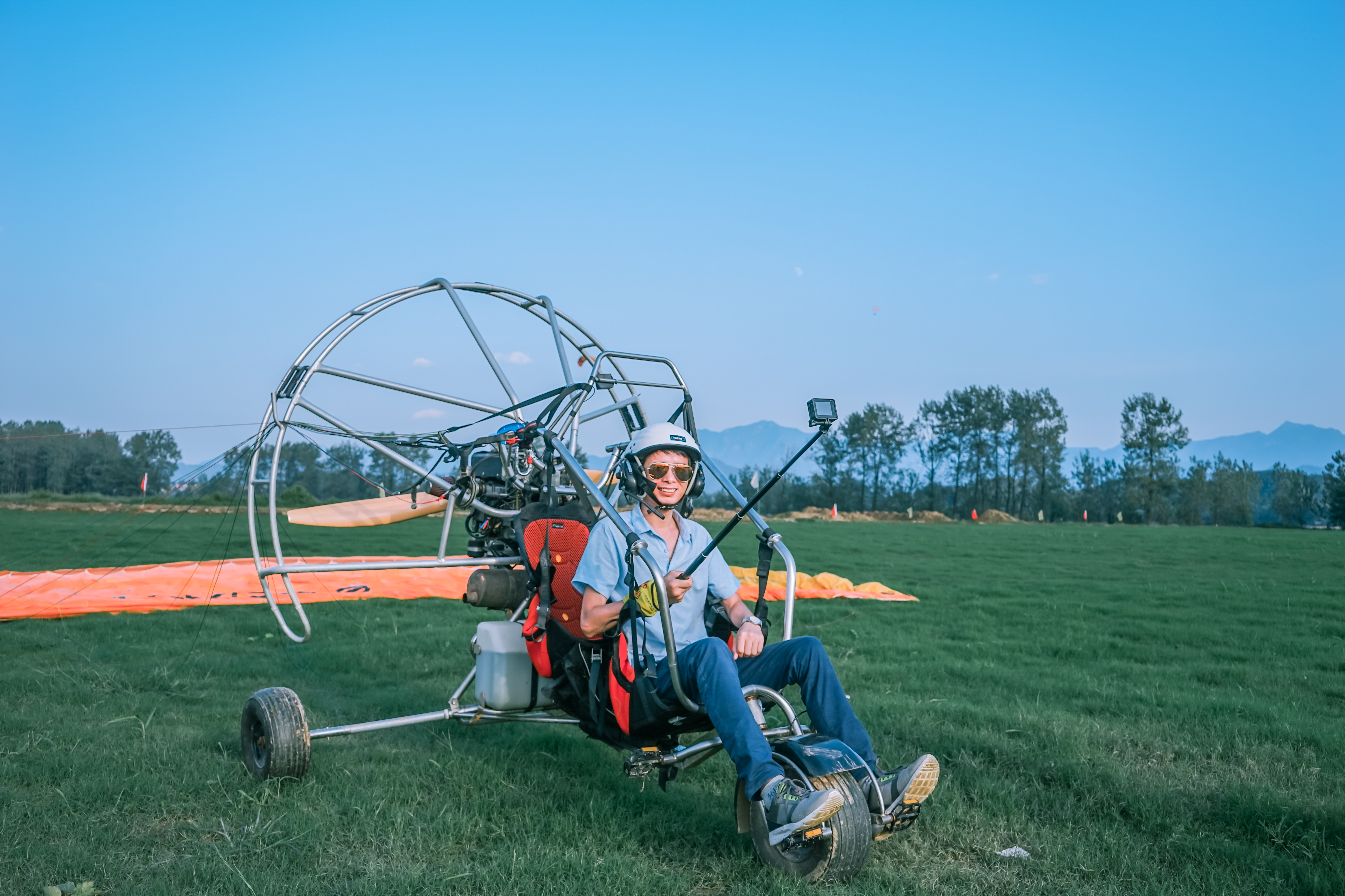 背后的圆框里就是动力伞的风叶了,由一台便携式的发动机驱动,小伙伴是坐在伞具的前端,这里会发给我们一个自拍的GO-PRO,为每个飞上天的我们留下最嗨的自拍照哦,即使在地面准备时候也不能忘了摆个酷酷的POSE~