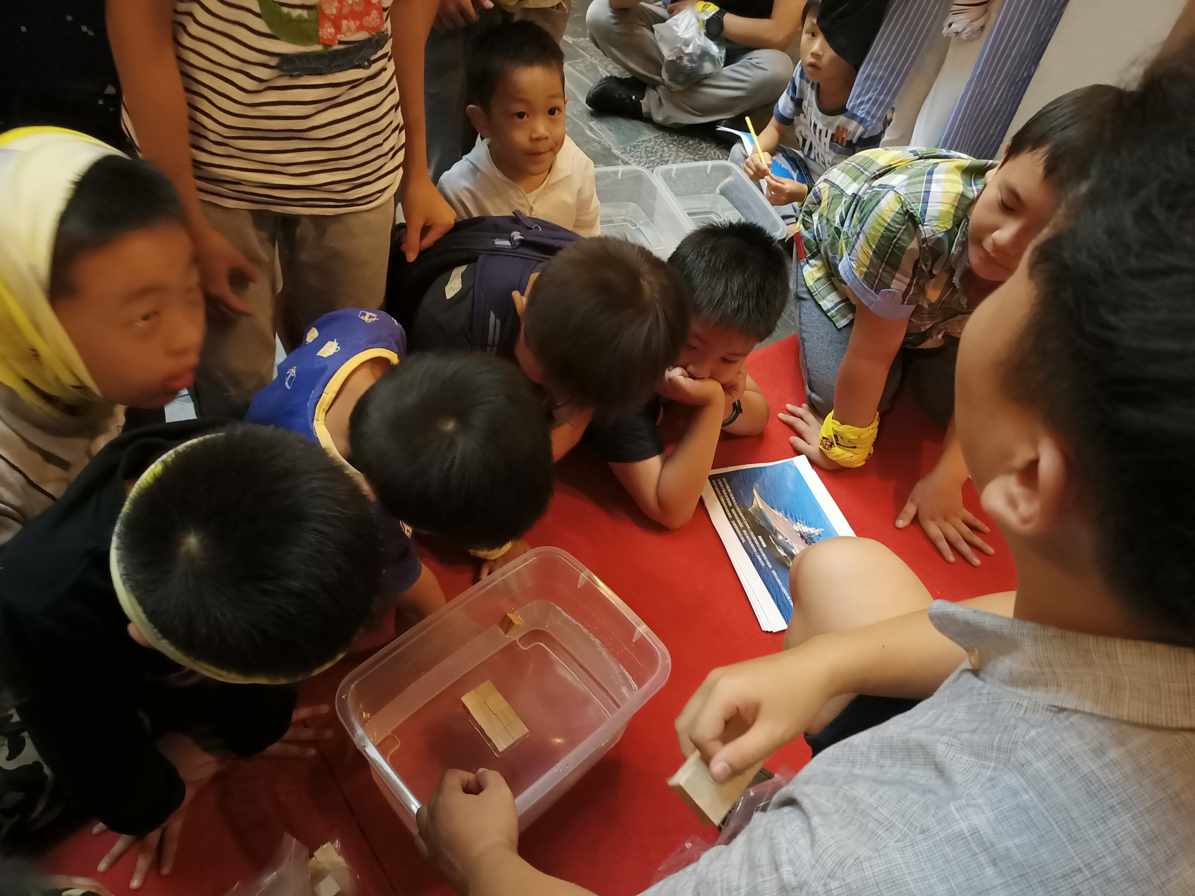 【实验】环节,让小学员们亲自体验浮力与压力的测试,了解到浮力与受力面积有关,压力与水的密度和深度有关。从而明白船只为什么会浮在水面上的科学原理。波浪实验中,则由佳玉老师模拟海上波浪,让学员们观察和了解波浪具有波动周期、波高、波长等波动的特性。