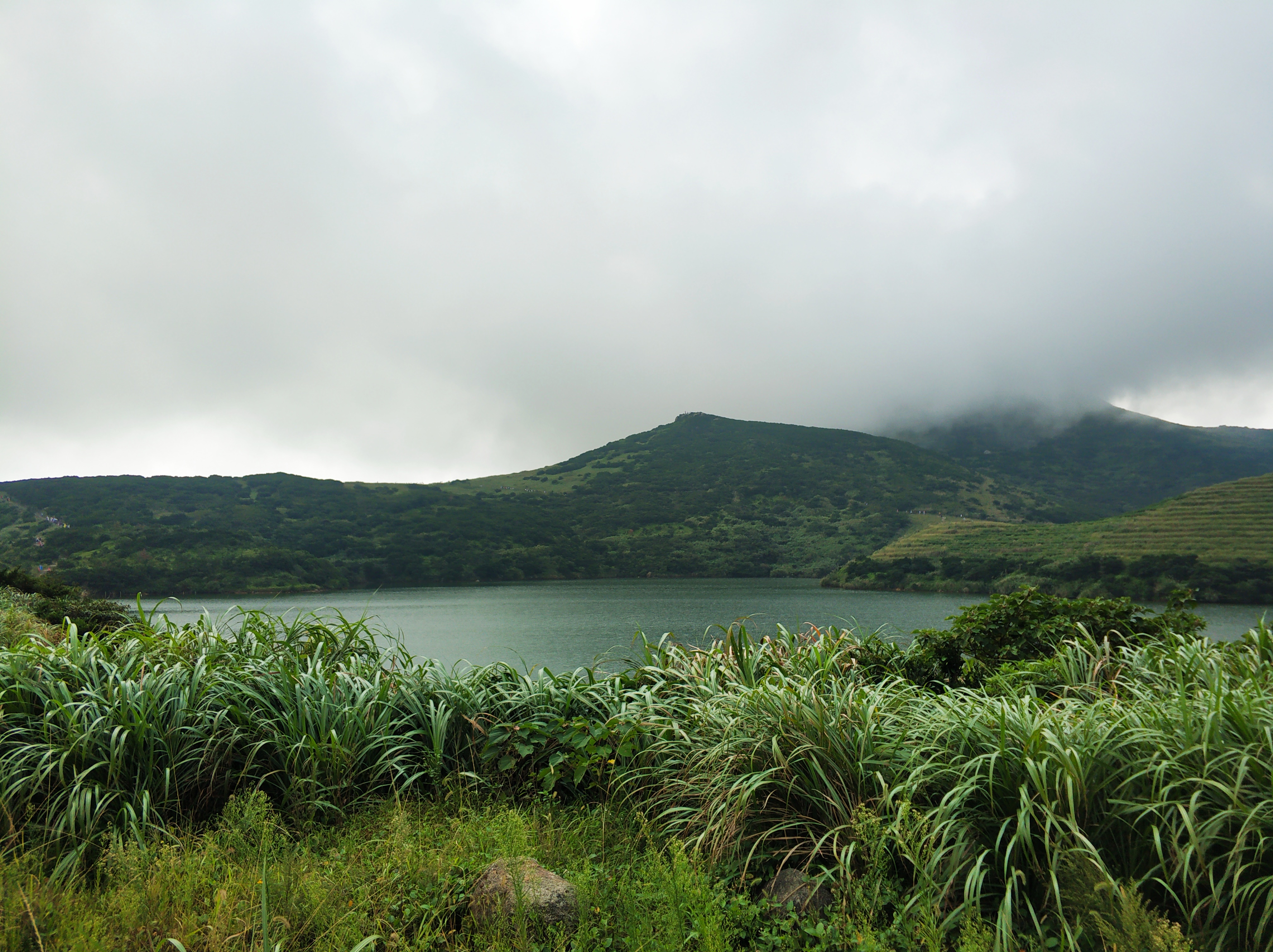 站上石阶的一处,四周的景象豁然开朗了起来。大嵛山岛上连绵的绿山环绕,山峦中还静静地躺着一个美丽静雅的湖泊--传说中的小天湖。天湖、群山、草坡/草地,真是别有一番情景在心头。