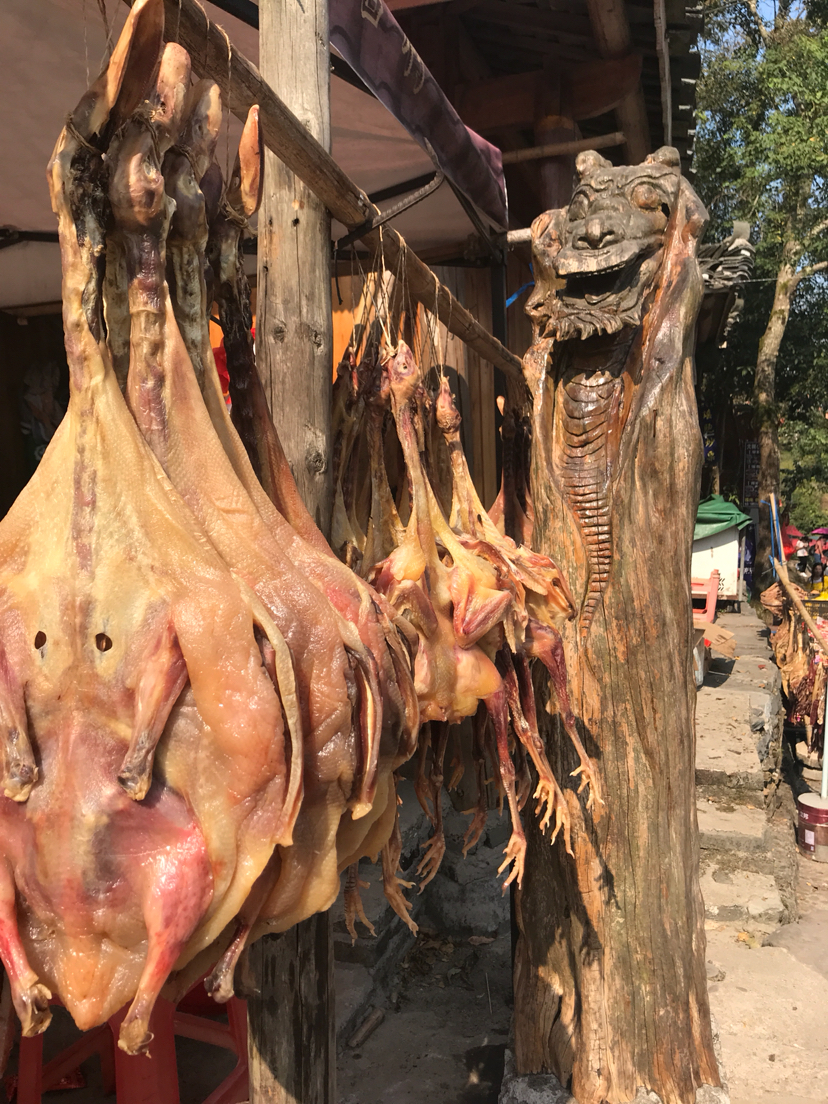 路两旁的小摊贩卖着琳琅满目的饰品、小玩意儿、米酒、茶叶、香料,最重要的是到处皆可见挂着的古法晒制的肉类,香味随着阵阵微风蔓延开,一股市井生活和历史痕迹的交融