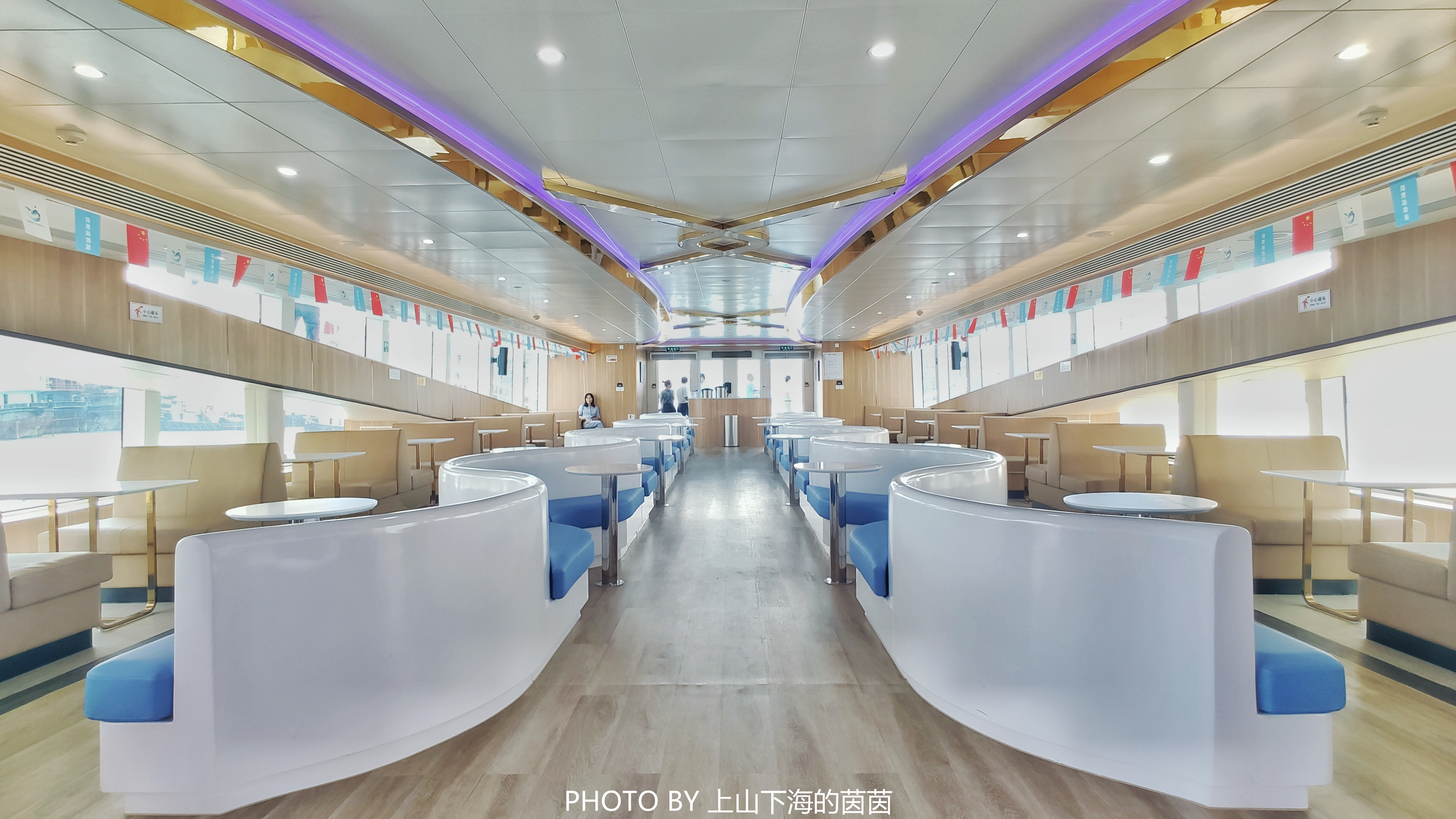 二层和顶层间“之”造型特有的缓坡走道替代了楼梯,成功释放了空间;二层的大幕墙窗使上下甲板实现自然过渡,舱内和舱外美景交辉相映。