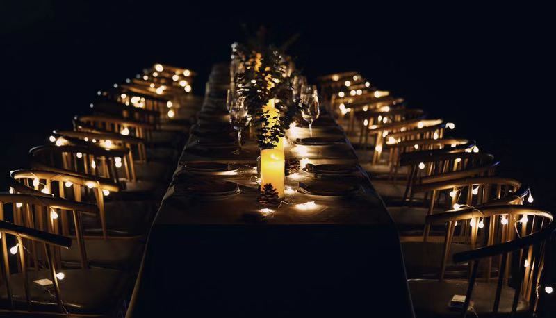 餐桌上蜡烛发出的微弱光芒映衬着椅子上的星星灯,