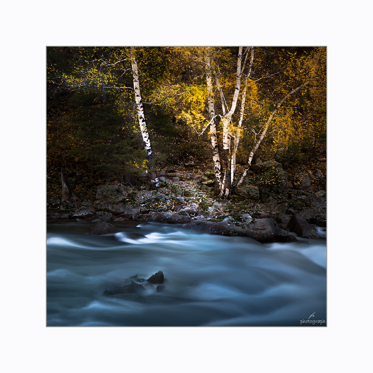 可可托海国家地质公园,在额尔齐斯大峡谷中,天然的氧吧、串串的流水、白桦树披着黄衣,嚓嚓的树声,惬意加上兴奋,走到了边界。