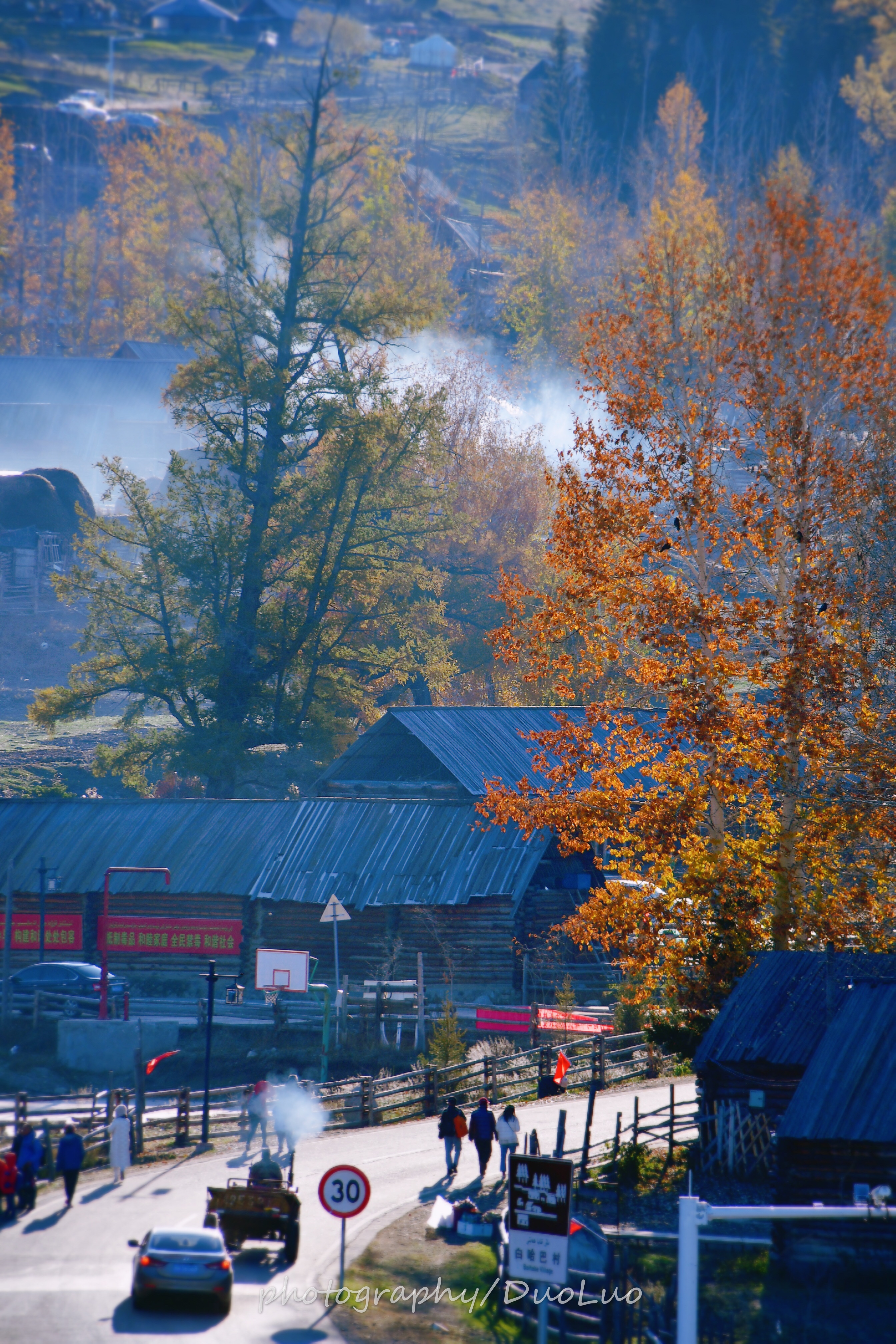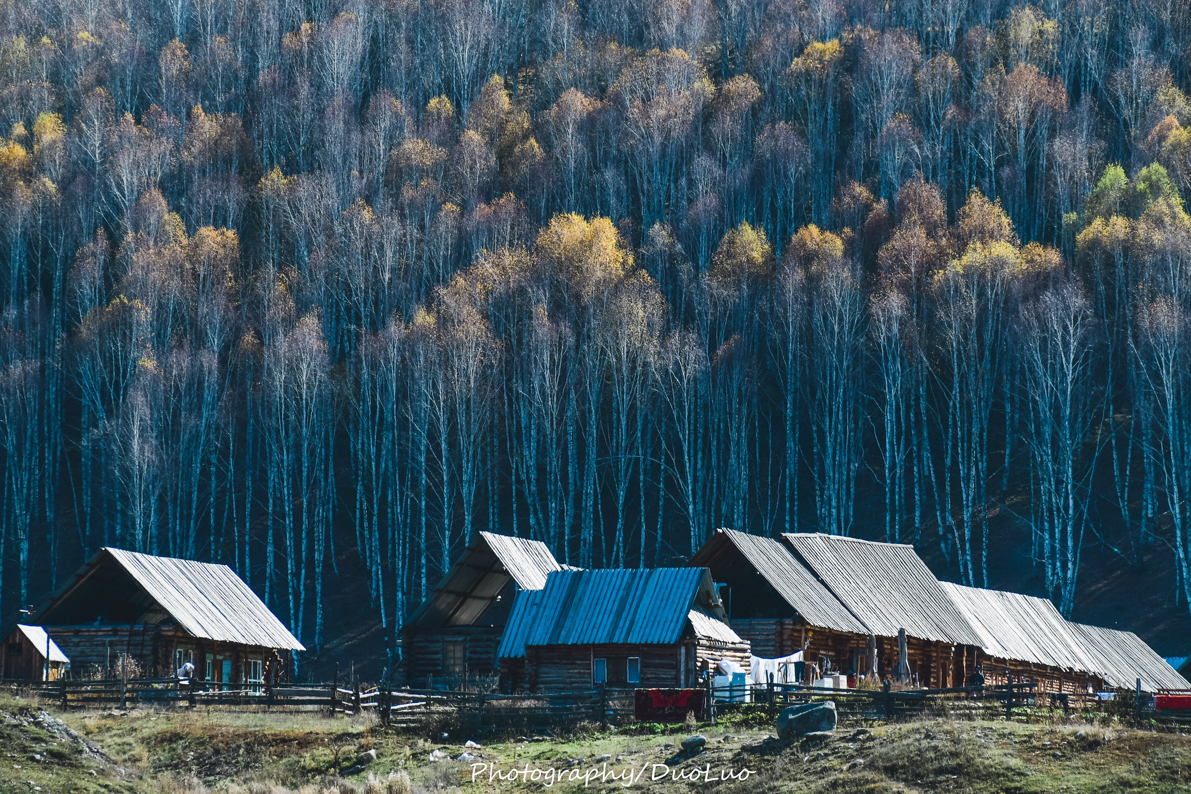 整个村庄坐落与阿尔泰山的一条沟谷之中,依山傍水,木屋散落,牛羊成群。