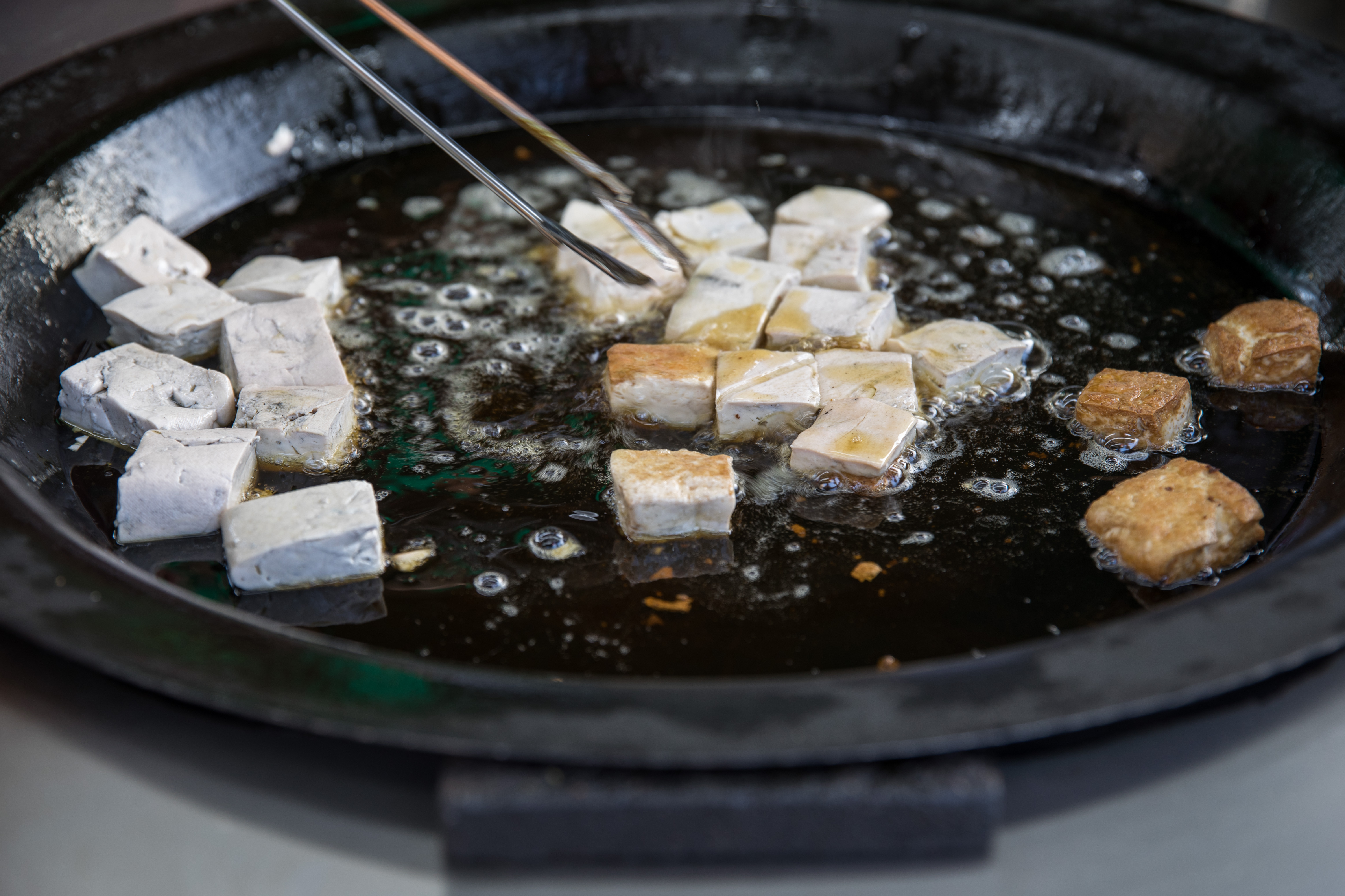 毛豆腐下油锅炸,配上辣椒调料,外面酥脆焦黄,里面粉嫩鲜香,简直美味!