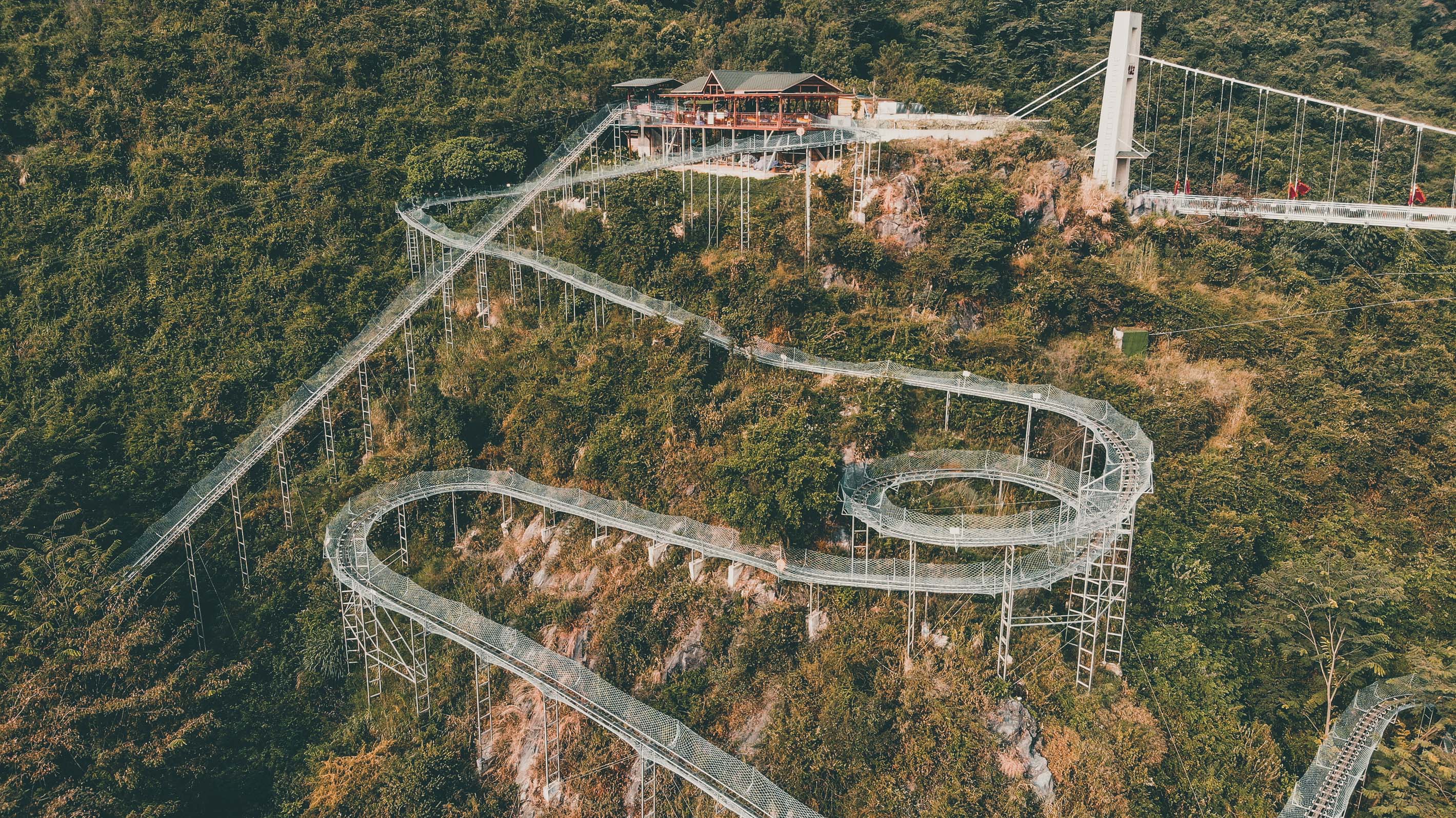 横跨狮子山与天山桥,这里是广东省内最长的观湖玻璃桥,也是世界上最长的喀斯特地貌湖景玻璃桥。脚下是绵延的山峦和醉人的天鹅湖,而此时若是开启玻璃桥的“山崩地裂“5D声光电特效装置,怕是要吓哭一批人。