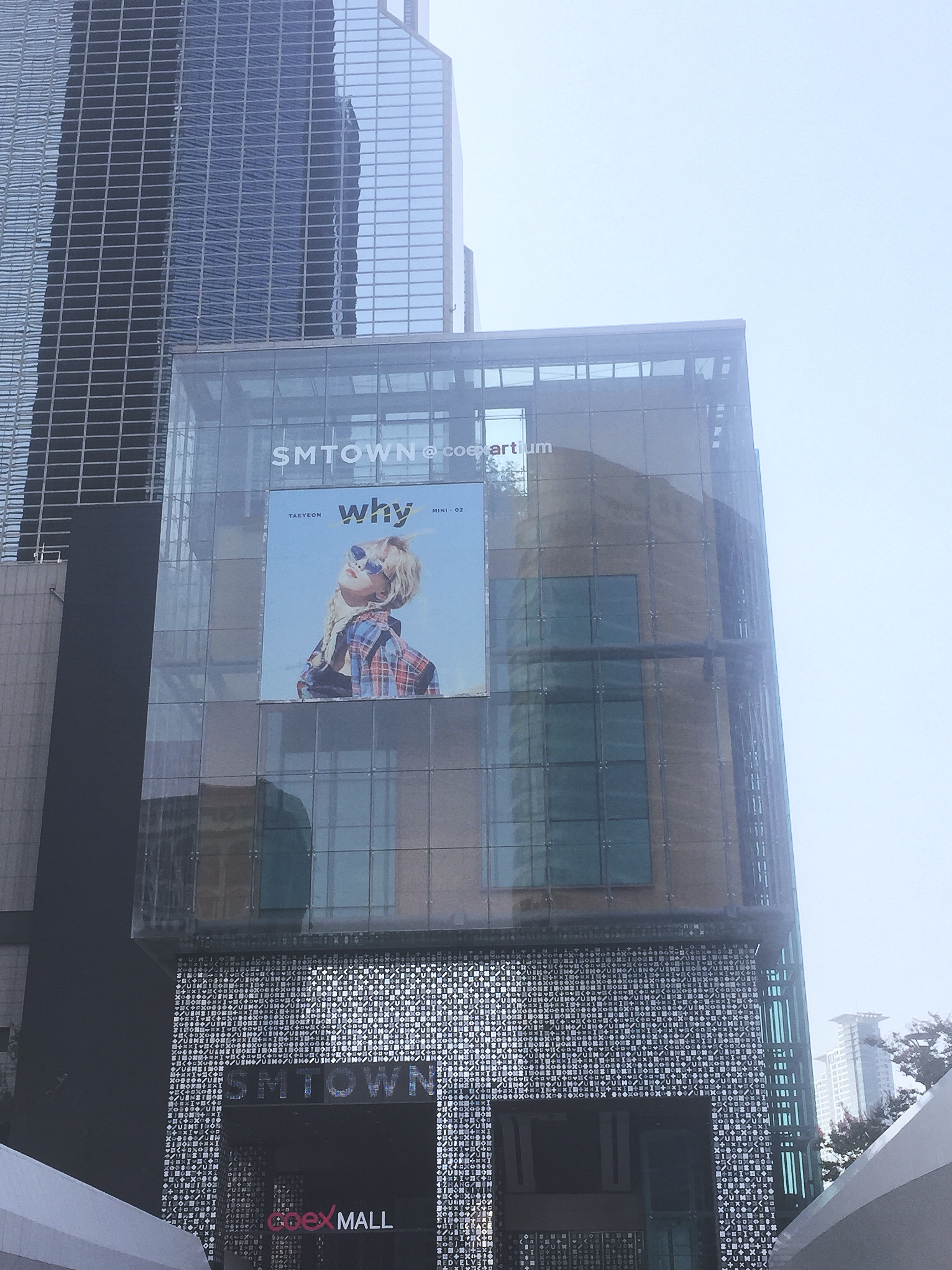 这座大厦是SM公司专卖旗下艺人周边以及衍生产品的集合商城。一共六层,1层welcomezone,播放SM艺人的各种视频。2层SUM,出售周边商品。3层为SMTOWN STUDIO,在这里可以像歌手一样体验拍摄画报MV等服务。4层为SMTOWN LIVErary CAFE,出售艺人专辑封面和形象的甜品等。5、6层 SMTOWN THEATRE,是可变公演场,播放音乐剧、演唱会等。