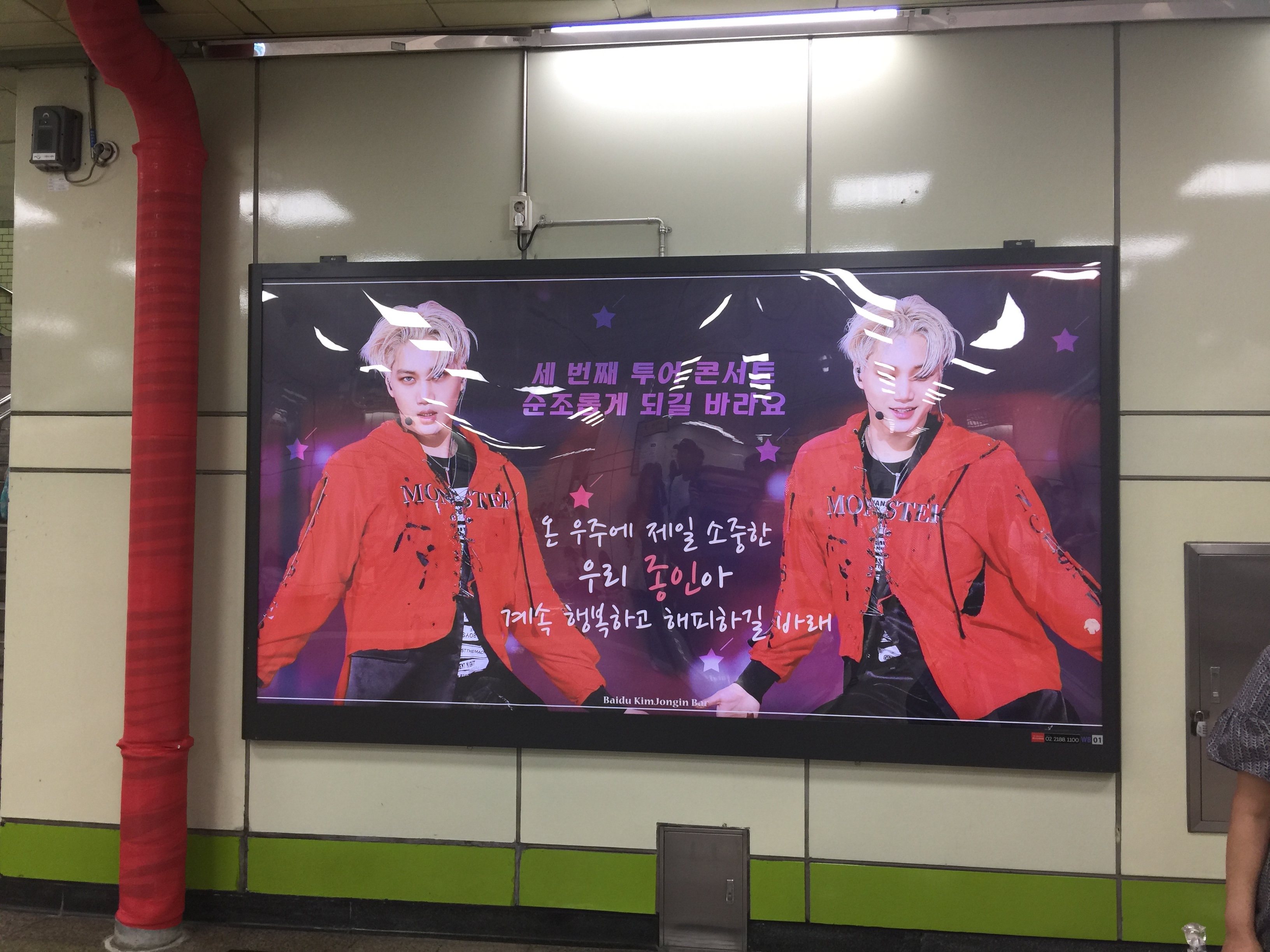 在去场馆的地铁通道里看到了很多为这次演唱会应援的地铁广告,都是粉丝自发的。