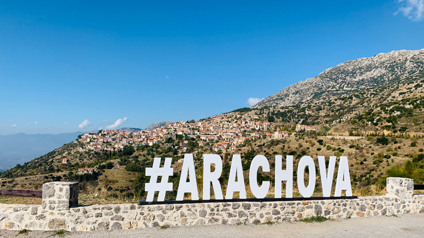 Arachova小镇坐落在帕尔纳索斯山一个山石嶙峋的山嘴上,海拔960米。古希腊神话传说中,帕纳索斯山是座圣山,这里居住着太阳神阿波罗与缪斯女神们。这个小镇是雅典前往德尔斐的必经之路。